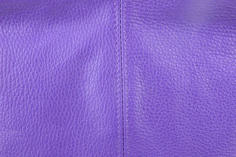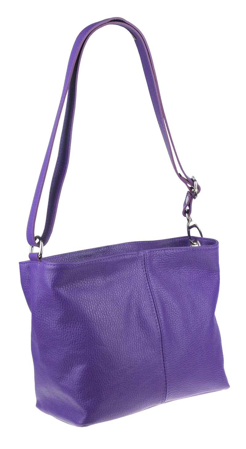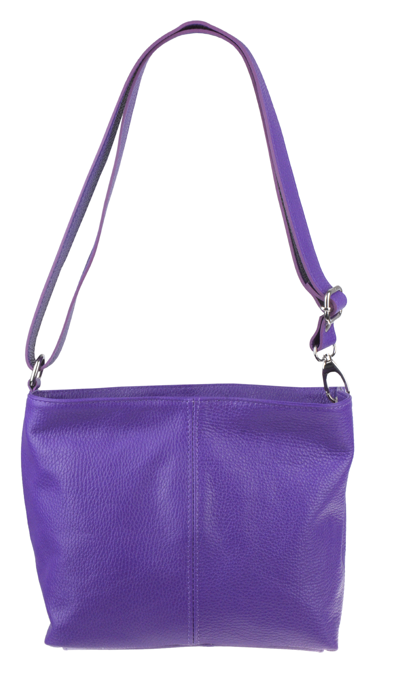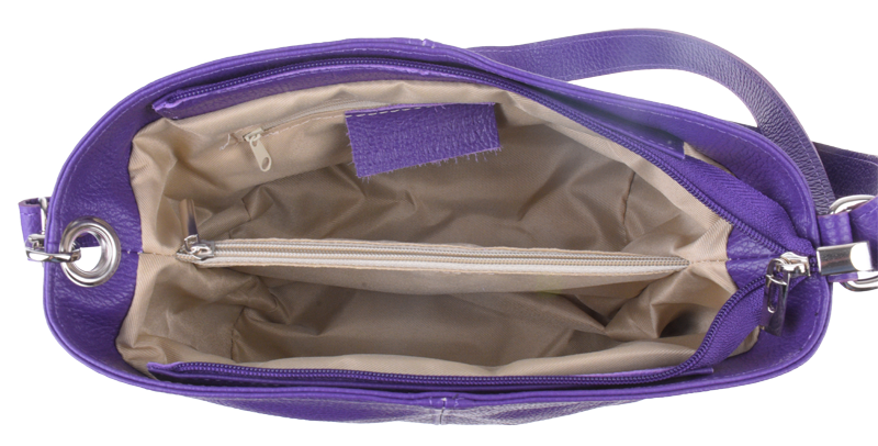 Fialová kabelka nositelná přes rameno či cross-body (křížem). Tato kožená kabelka je uzavíratelná na zip. Uvnitř kabelky najdeme přepážku uprostřed, která zároveň slouží jako kapsa na zip, a na boční stěně pak kapsu na zip. Hloubka jejího dna je 13 cm.