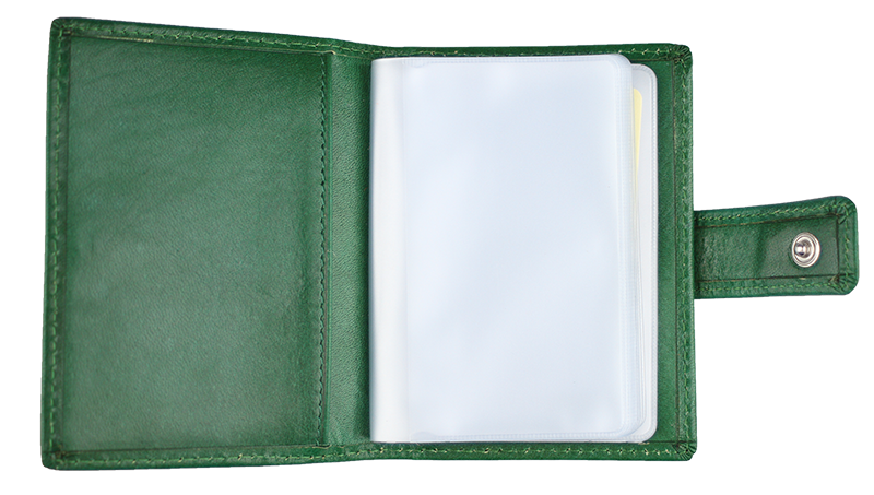 Elegantní a zároveň velice praktická peněženka moderního designu v zelené barvě. Tato kožená peněženka na karty (22 kapes) obdélníkového tvaru se zapíná na patentek.