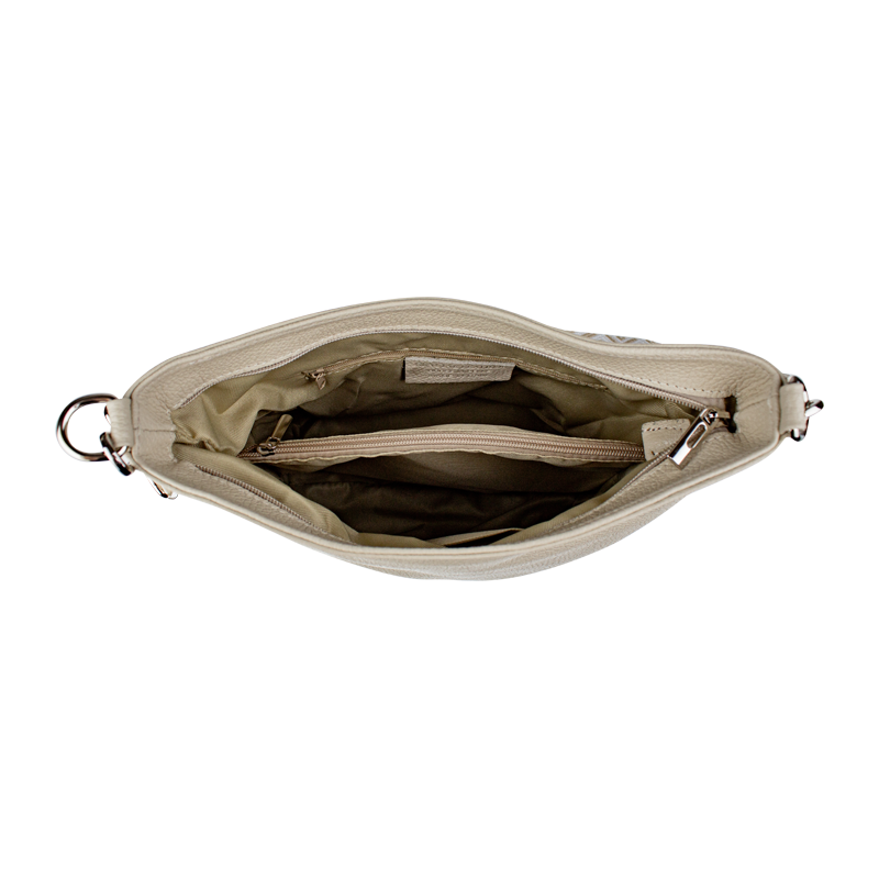 Klasická praktická kabelka s jednoduchým designem a stylovým přídavným popruhem. Nositelná přes rameno nebo crossbody. Kabelka je uzavíratelná na zip a je vyrobena z pravé poctivé kůže. Uvnitř kabelky najdeme přepážku uprostřed, která zároveň slouží jako kapsa na zip, a na bočních stěnách pak kapsu na zip a na druhé straně další malou kapsu.