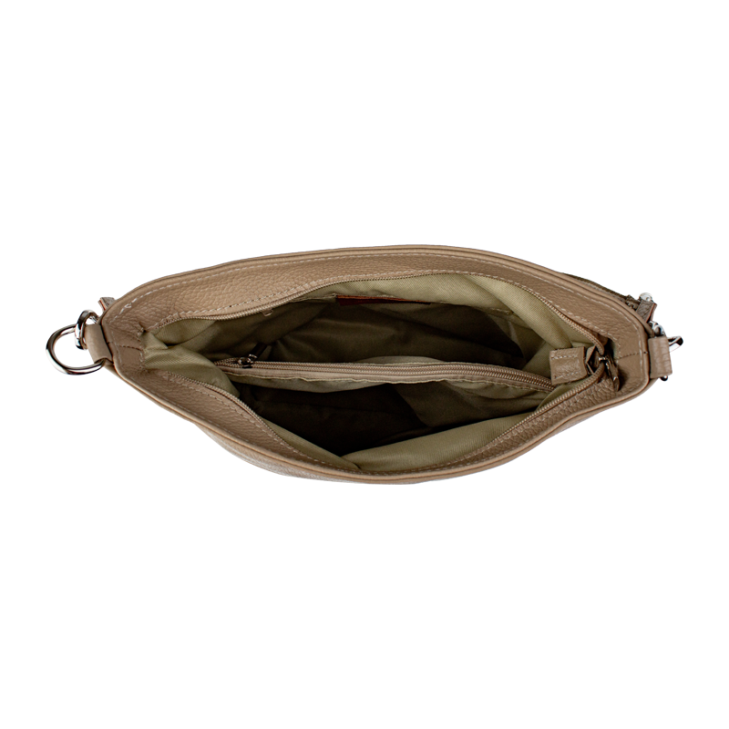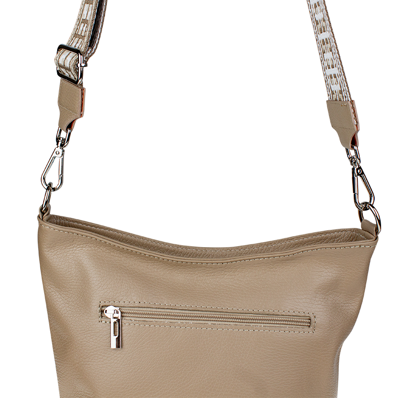 Klasická praktická kabelka s jednoduchým designem a stylovým přídavným popruhem. Nositelná přes rameno nebo crossbody. Kabelka je uzavíratelná na zip a je vyrobena z pravé poctivé kůže. Uvnitř kabelky najdeme přepážku uprostřed, která zároveň slouží jako kapsa na zip, a na bočních stěnách pak kapsu na zip a na druhé straně další malou kapsu.