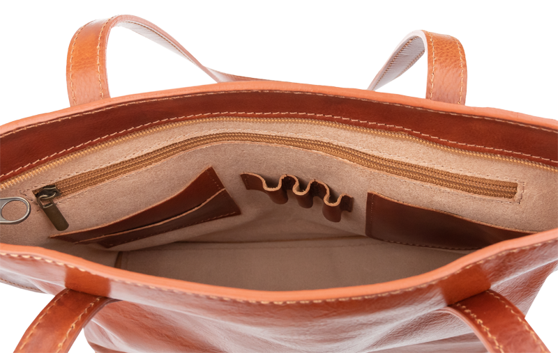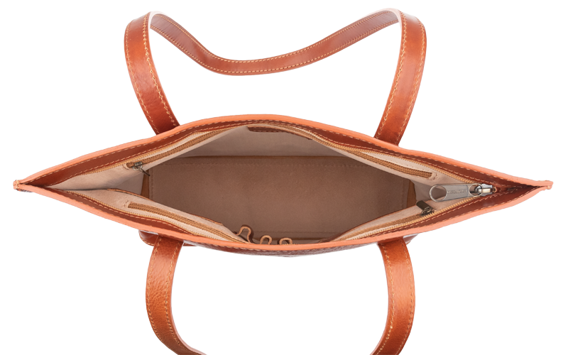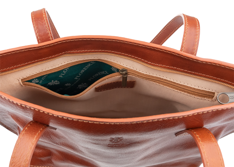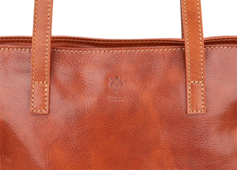 Pohodlné kožené rukojeti jsou dostatečně dlouhé pro nošení na rameni, což zajišťuje maximální komfort i při plném zatížení. Vnitřní uspořádání s kapsami (pokud jsou) vám pomůže udržet si pořádek.