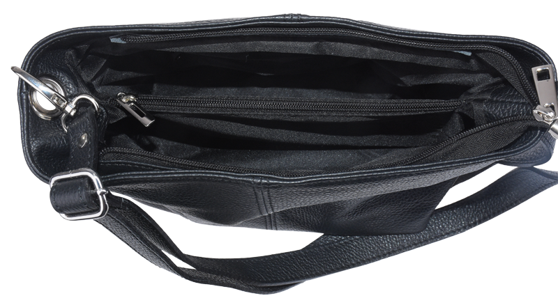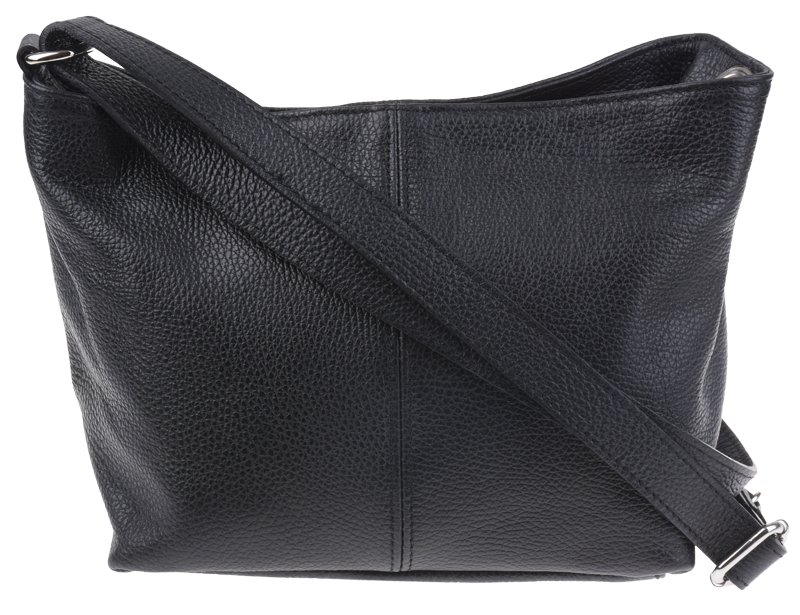 Set kabelky a přídavného popruhu. Černá kabelka nositelná přes rameno či cross-body (křížem). Tato kožená kabelka je uzavíratelná na zip. Uvnitř kabelky najdeme přepážku uprostřed, která zároveň slouží jako kapsa na zip, a na boční stěně pak kapsu na zip. Hloubka jejího dna je 13 cm. Kabelka má navíc nastavitelný popruh s maximální délkou cca 120 cm.