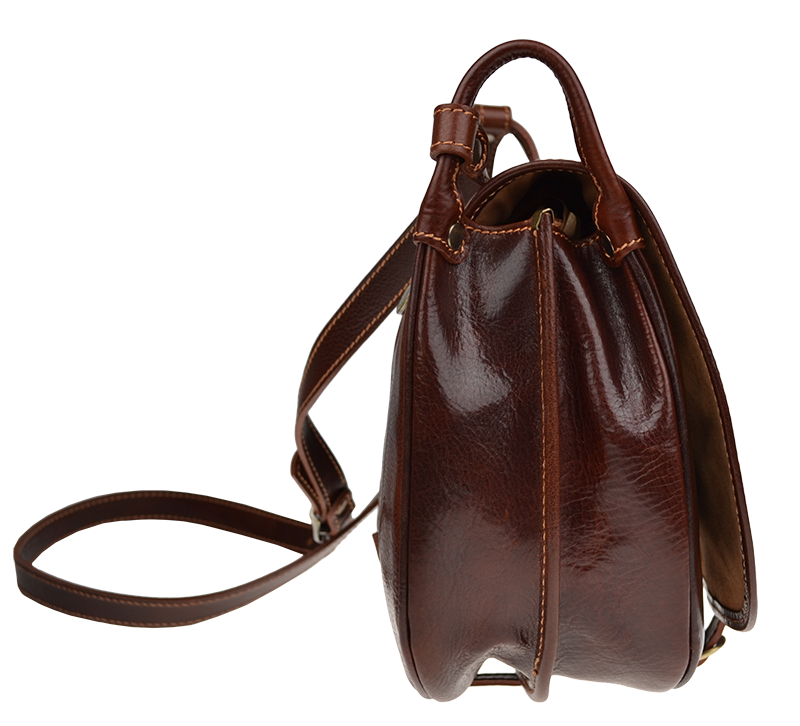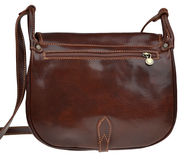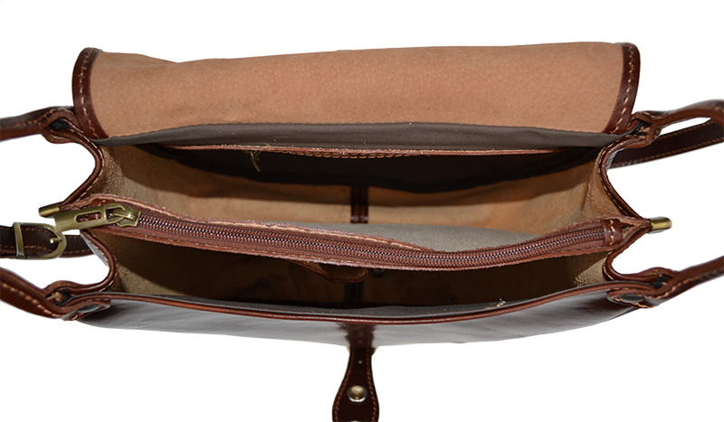 Speciální kabelka s klasickým loveckým designem, v hnědé barvě, uzavíratelná pomocí důmyslného poklopu na patentky – jeho pásek je pouze ozdobou. Nosí se přes rameno nebo cross-body (křížem). Uvnitř kabelky najdeme přepážku uprostřed, která zároveň slouží jako kapsa na zip, a na bočních stěnách pak kapsu na zip a na druhé straně další malou kapsu. Kabelka má k tomu všemu navíc kapsu na zip na vnější zadní straně. Max. délka popruhu je 120 cm.