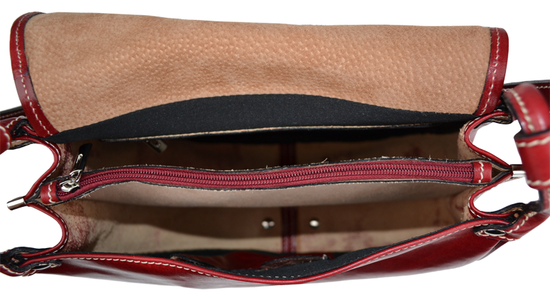 Speciální červená kabelka s klasickým loveckým designem uzavíratelná pomocí důmyslného poklopu na patentky – jeho pásek je pouze ozdobou. Nosí se přes rameno nebo cross-body (křížem). Uvnitř kabelky najdeme přepážku uprostřed, která zároveň slouží jako kapsa na zip, a na bočních stěnách pak kapsu na zip a na druhé straně další malou kapsu. Kabelka má k tomu všemu navíc kapsu na zip na vnější zadní straně. Max. délka popruhu je 120 cm. Barva kování je ve stříbrné barvě.