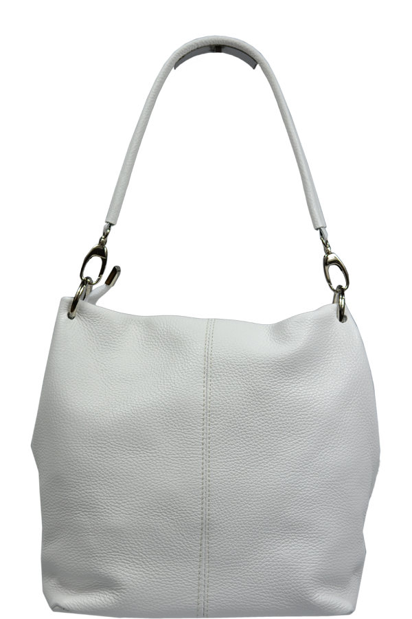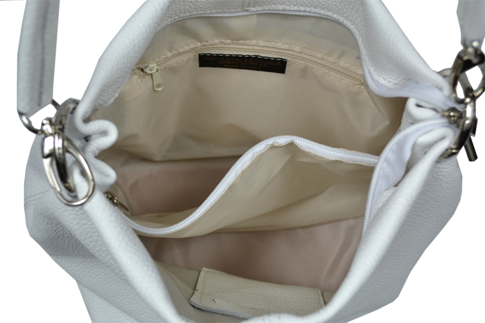 Klasická praktická kabelka s jednoduchým designem v bílé barvě. Nositelná přes rameno. Kabelka je uzavíratelná na zip a je vyrobena z pravé poctové kůže. Uvnitř kabelky najdeme přepážku uprostřed, která zároveň slouží jako kapsa na zip, a na bočních stěnách pak kapsu na zip a na druhé straně další malou kapsu. Hloubka její dna činí 14,5 cm.