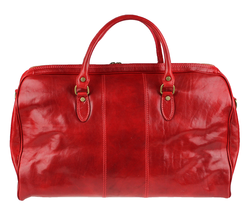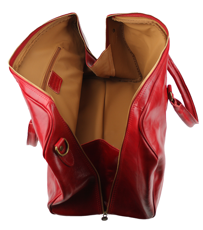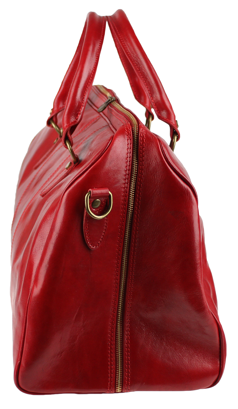Luxusní kožená cestovní taška v červené barvě. Taška je vyrobena z hladké kvalitní Italské kůže. Součástí tašky je přídavný popruh o délce 107 cm. Taška se uzavírá kovovým zipem. Cestujte stylově s koženou taškou!
