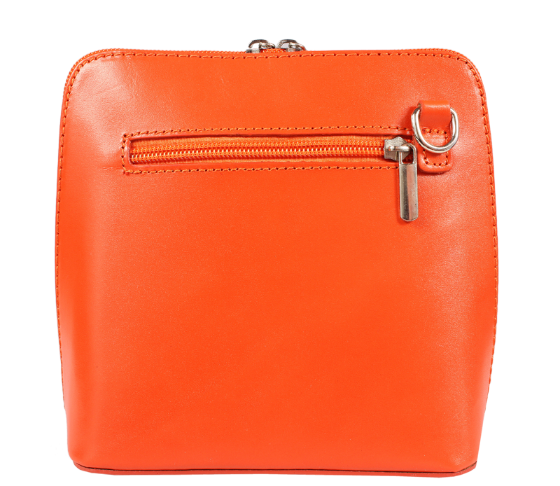 Elegantní, ale zároveň velmi praktická oranžová kabelka malých rozměrů vyrobena z pravé kůže. Díky tenkému pásku je nositelná přes rameno. Zip, kterým se uzavírá, vede po hraně kabelky až po spodní okraj na obou stranách, a proto je její vnitřek dobře dostupný. Na vnější zadní straně najdete na kabelce malou kapsu na zip a uvnitř dělí celý prostor na dvě části příčka, která současně slouží jako kapsa na zip. Hloubka jejího dna je 8 cm. Délka přídavného popruhu je cca 120 cm.