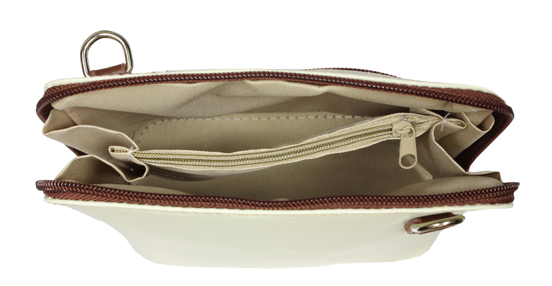 Elegantní, ale zároveň velmi praktická béžová kabelka malých rozměrů vyrobena z pravé kůže. Díky tenkému pásku je nositelná přes rameno. Zip, kterým se uzavírá, vede po hraně kabelky až po spodní okraj na obou stranách, a proto je její vnitřek dobře dostupný. Na vnější zadní straně najdete na kabelce malou kapsu na zip a uvnitř dělí celý prostor na dvě části příčka, která současně slouží jako kapsa na zip. Hloubka jejího dna je 8 cm. Délka přídavného popruhu je cca 120 cm.