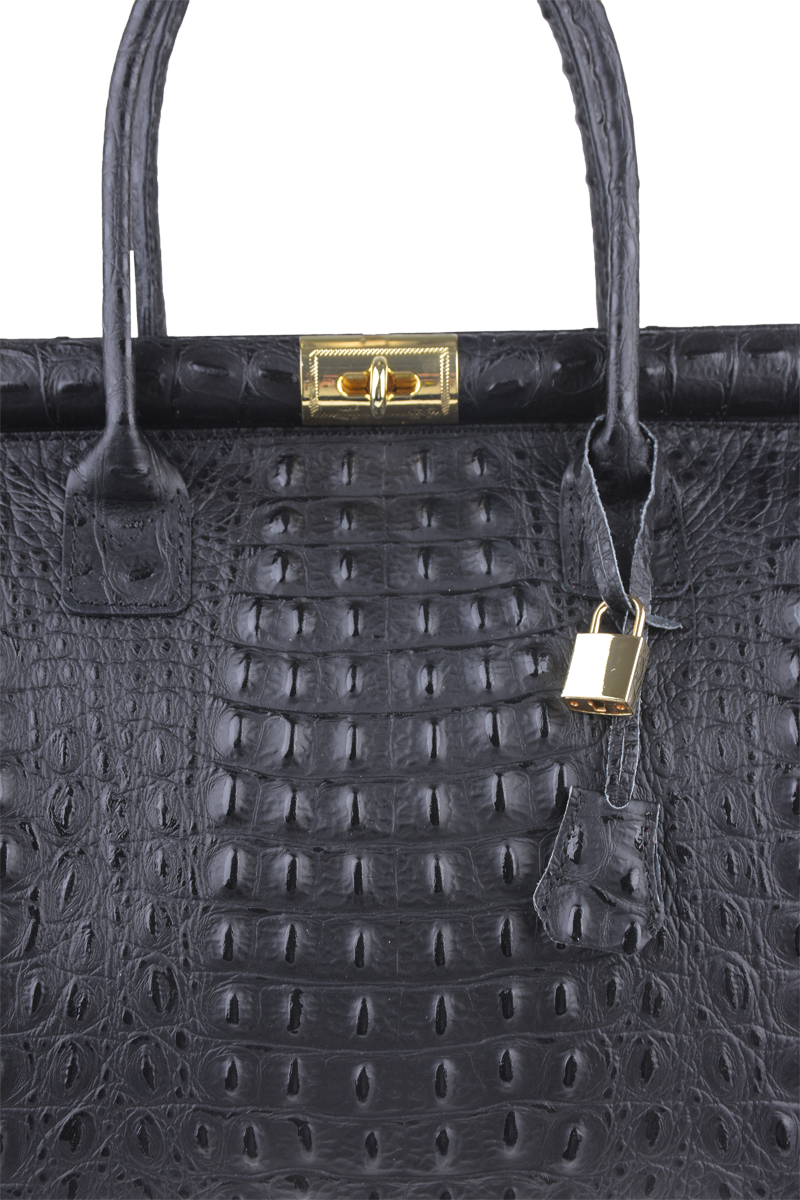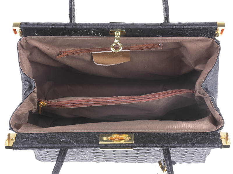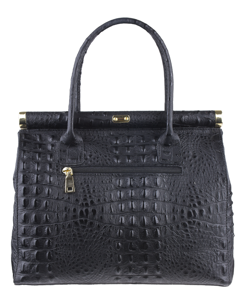 Tato kabelka zvaná též "doktorská" se může pochlubit kromě svého klasického designu tím, že dobře drží tvar. Tato kožená kabelka je nositelná do ruky a uzavíratelná na patentek, který pak v případě potřeby můžete uzamknout přiloženým zámečkem. Jejím materiálem je pravá kůže v černé barvě s úpravou krokodýlí textury. Uvnitř najdete kapsu na zip a 2 malé kapsy vhodné např. pro Váš mobil a peněženku a uprostřed je látková přepážka také s kapsou na zip. Kabelka má navíc k tomu všemu kapsu na zip na vnější zadní straně. Hloubka jejího dna je 15 cm.