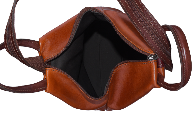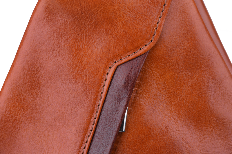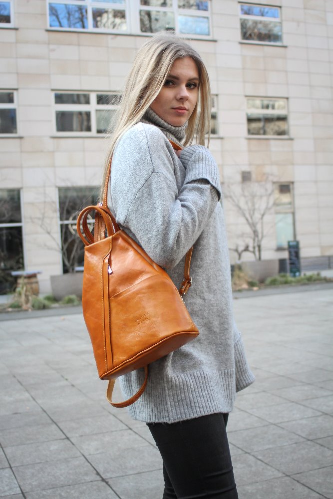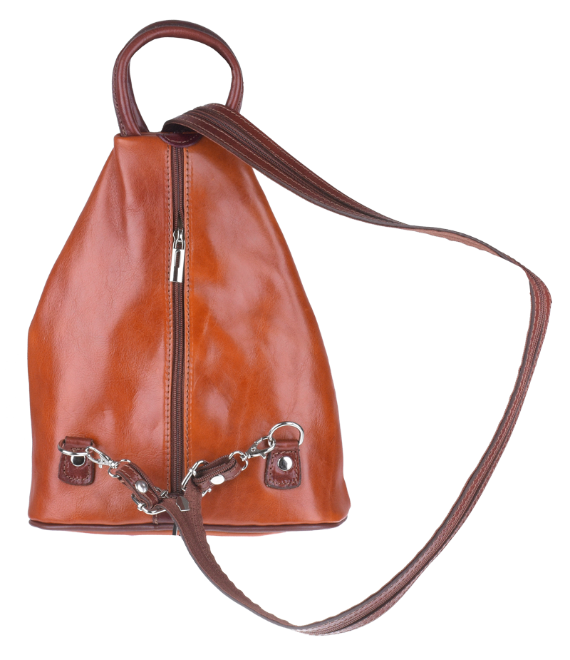 Jedinečný kožený batůžek v camel barvě se zajímavým tvarem. Pěkně ho zdobí nenápadný detail na přední straně. Batůžek se otvírá zboku na zip. Velmi zajímavé jsou popruhy batohu, které se rozepínají na zip, čímž si můžete libovolně upravit způsob nošení batůžku.