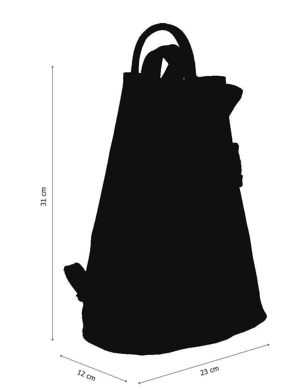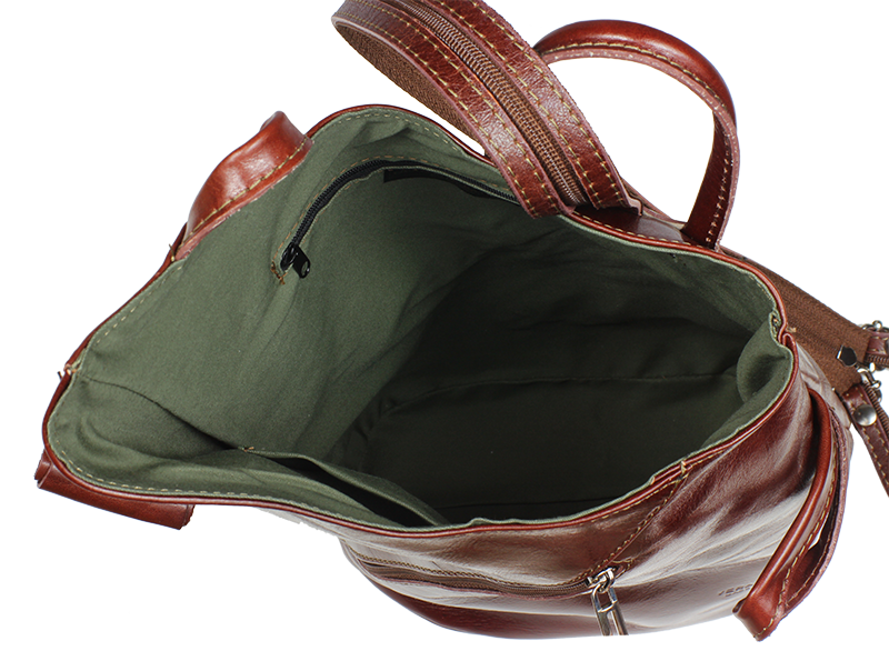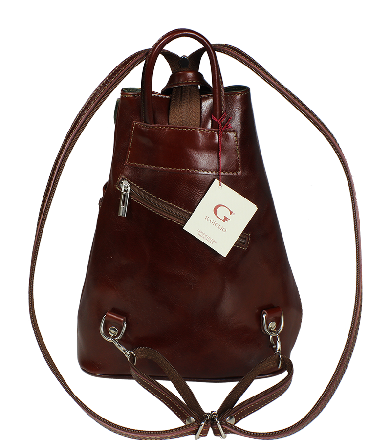 Jedinečný kožený batůžek se zajímavým tvarem. Dominantním prvkem kabelky je její zapínání na kožený knoflík. Zvenku u uvnitř kabelky můžete využít malé zapínací kapsy na zip pro Váš mobil či klíče. Velmi zajímavé je provedení popruhů batůžku, popruhy lze upravit zipem a tím si můžete určit způsob nošení batůžku.