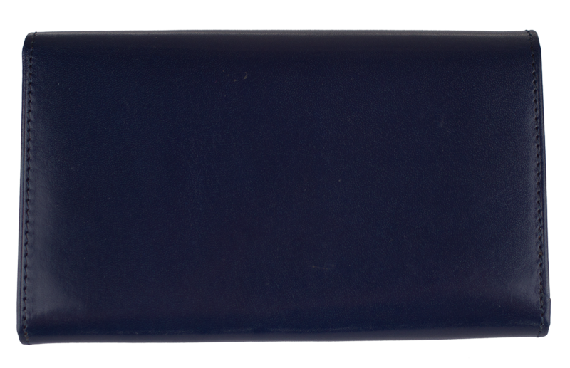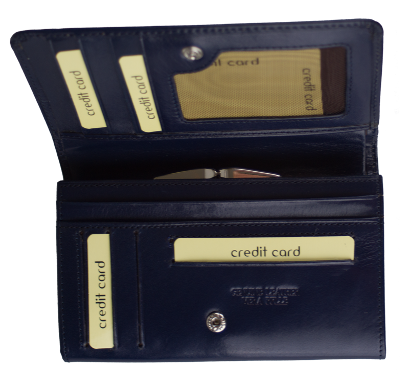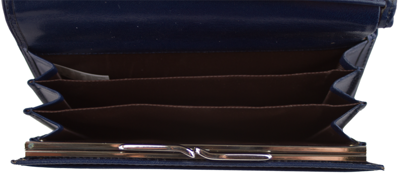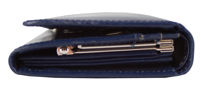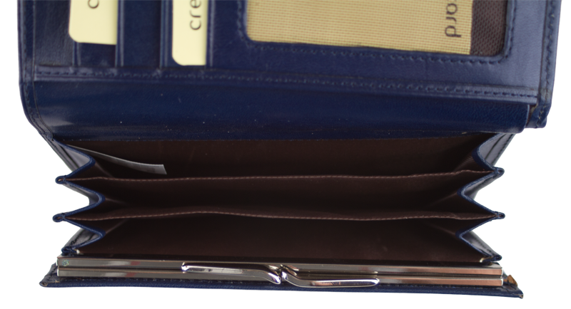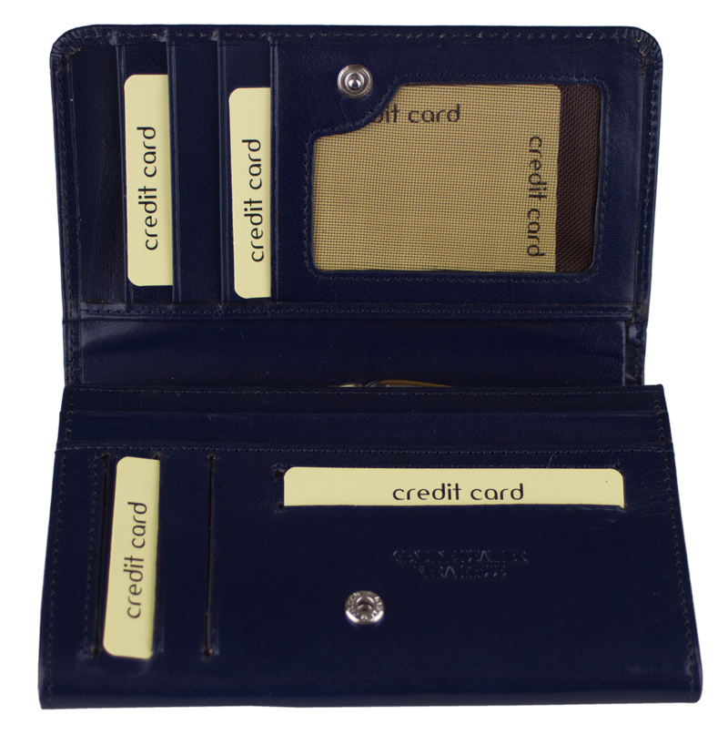 Elegantní dámská peněženka obdélníkového tvaru v modré barvě. Její moderní design se snoubí s její praktičností. Tato kožená peněženka se zavírá na patentek. Disponuje 2 komorami na bankovky a celkem 9 kapsičkami na platební a jiné karty; dále pak 4 přihrádkami. Jedna z jejích vnitřních částí je uzavíratelná na patentek.