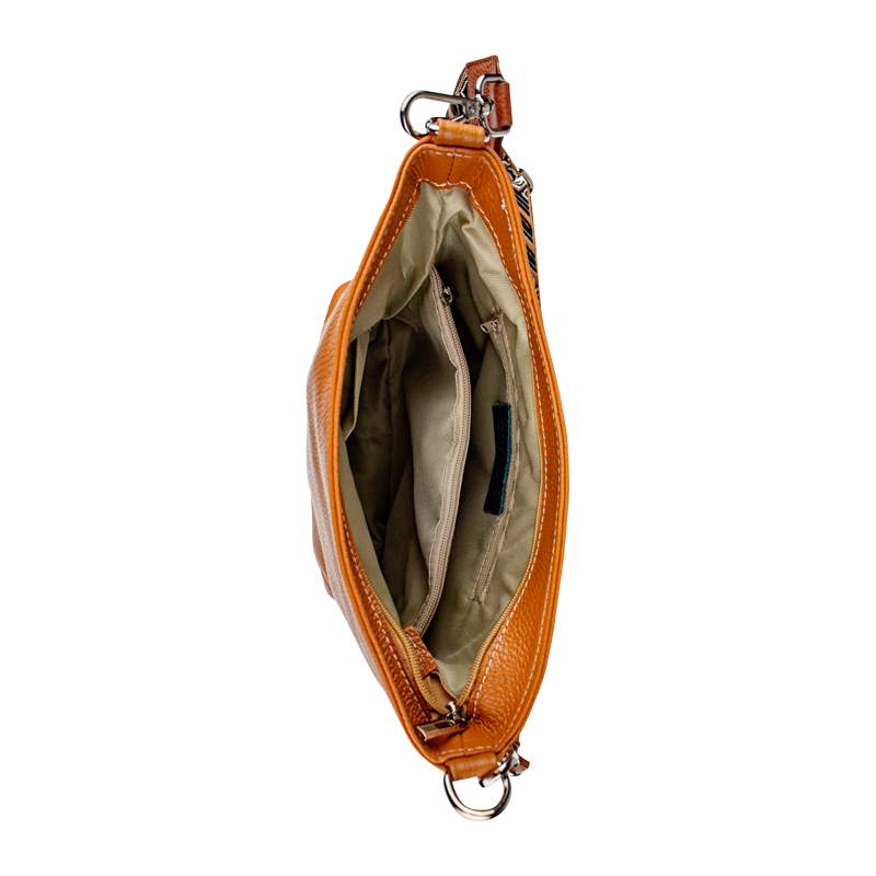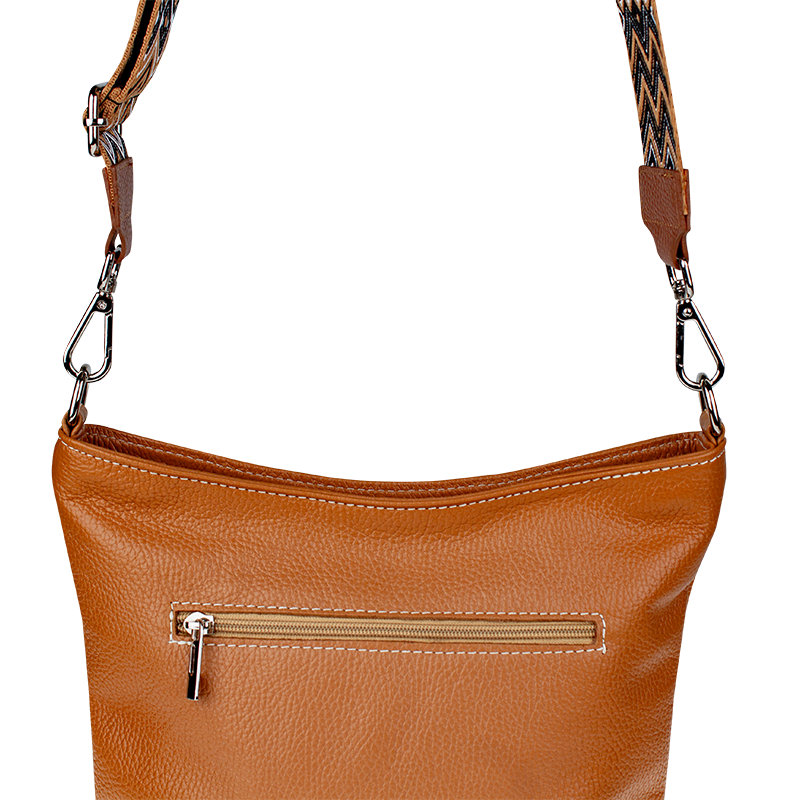 Klasická praktická kabelka s jednoduchým designem a stylovým přídavným popruhem. Nositelná přes rameno nebo crossbody. Kabelka je uzavíratelná na zip a je vyrobena z pravé poctivé kůže. Uvnitř kabelky najdeme přepážku uprostřed, která zároveň slouží jako kapsa na zip, a na bočních stěnách pak kapsu na zip a na druhé straně další malou kapsu.