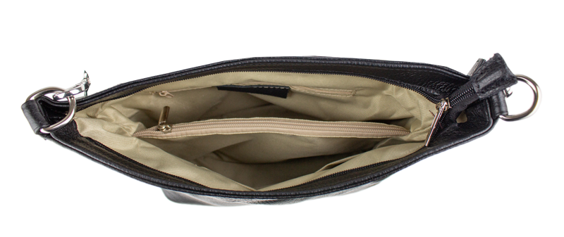 Klasická praktická kabelka s jednoduchým designem a stylovým přídavným popruhem. Nositelná přes rameno nebo crossbody. Kabelka je uzavíratelná na zip a je vyrobena z pravé poctivé kůže. Uvnitř kabelky najdeme přepážku uprostřed, která zároveň slouží jako kapsa na zip, a na bočních stěnách pak kapsu na zip a na druhé straně další malou kapsu.