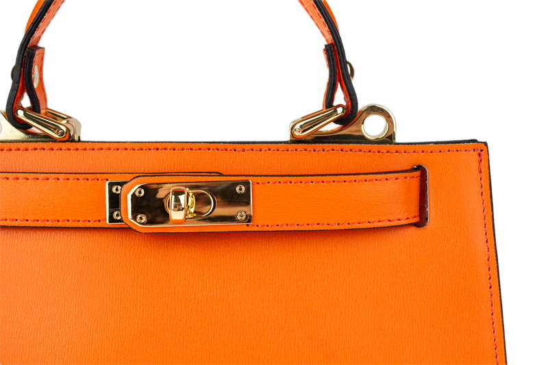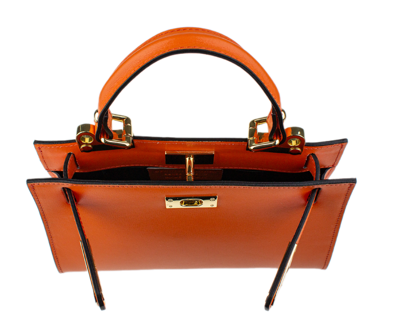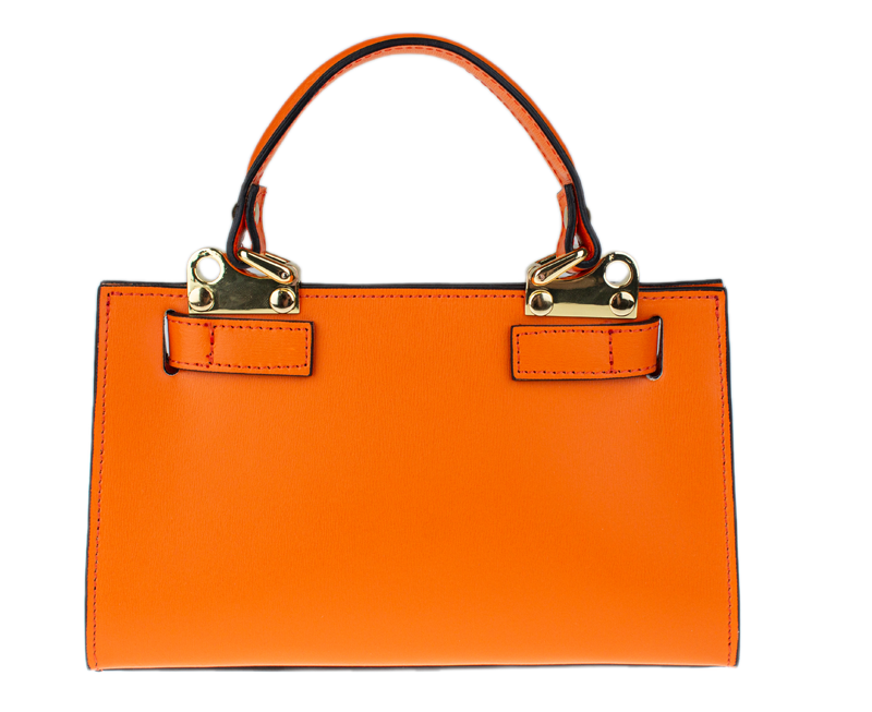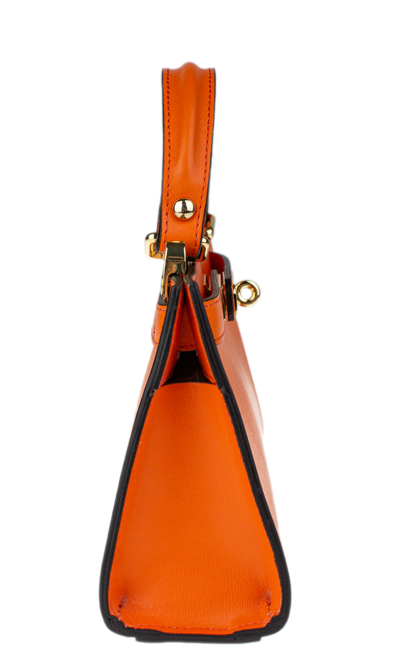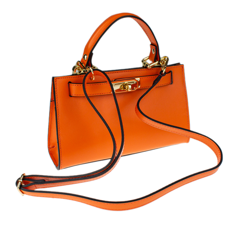 Malá kabelka z pevné kůže v oranžové barvě. Kabelku lze nosit v ruce nebo přes rameno. Max. délka přídavného pásku je 115 cm. Kabelka je vybavena důmyslným a elegantním zapínáním. Uvnitř kabelky nalezneme kapsu na mobil či klíče.