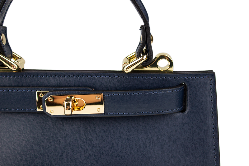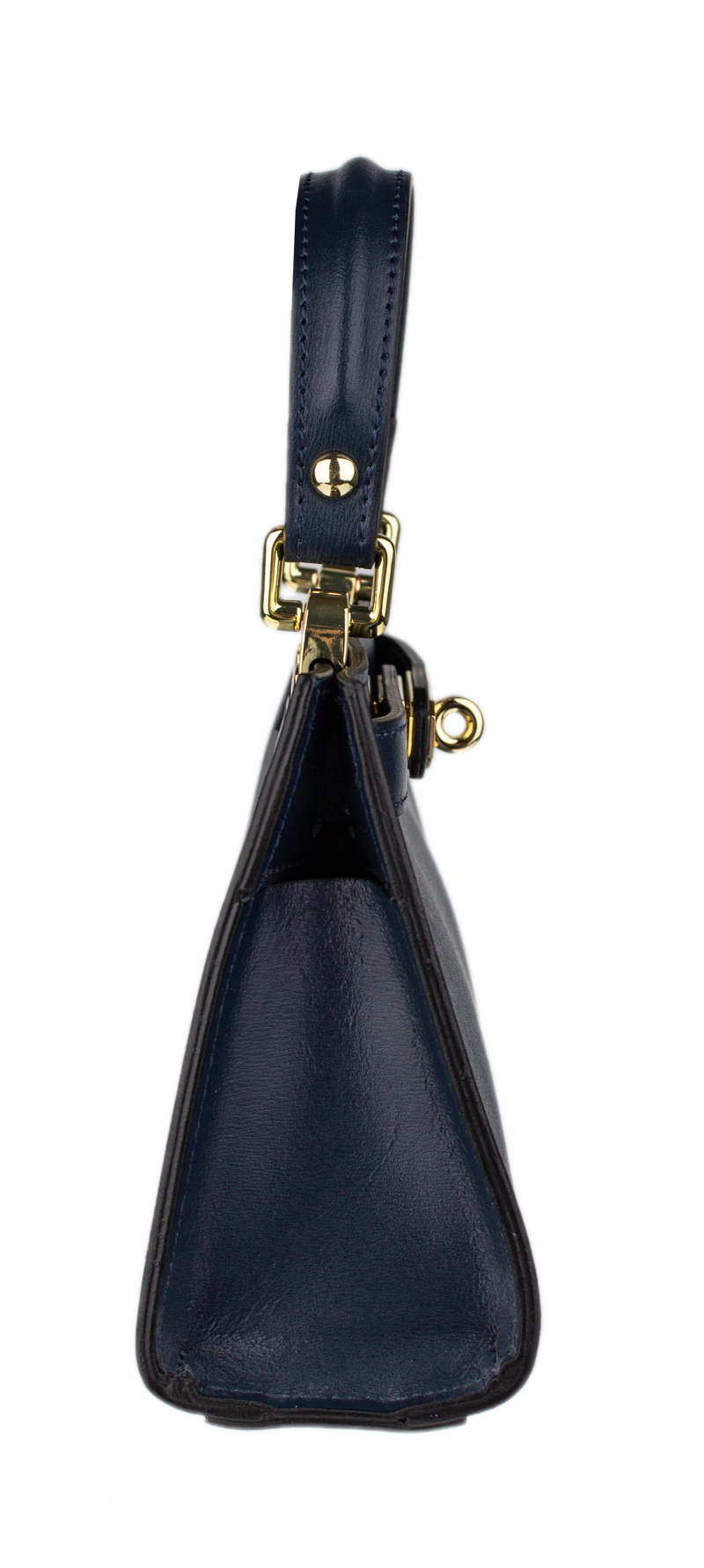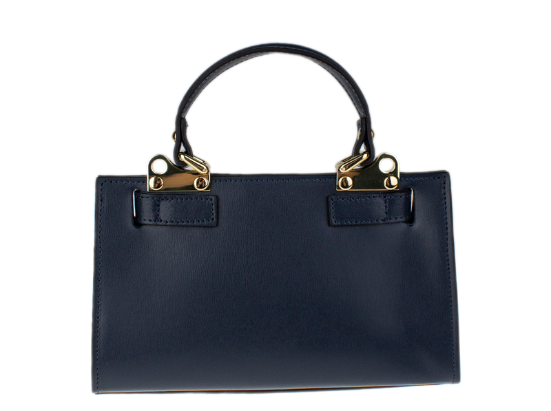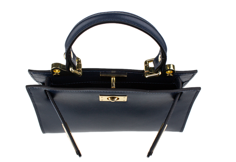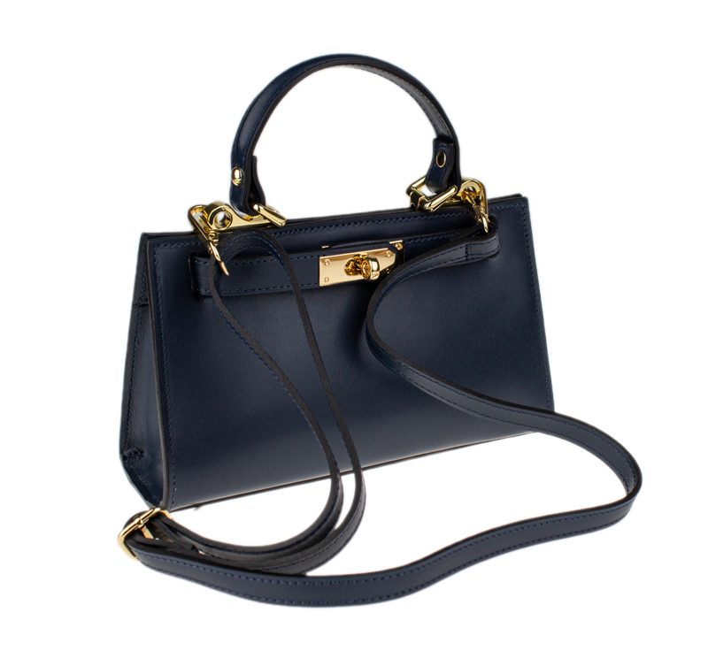 Malá kabelka z pevné kůže v modré barvě. Kabelku lze nosit v ruce nebo přes rameno. Max. délka přídavného pásku je 115 cm. Kabelka je vybavena důmyslným a elegantním zapínáním. Uvnitř kabelky nalezneme kapsu na mobil či klíče.