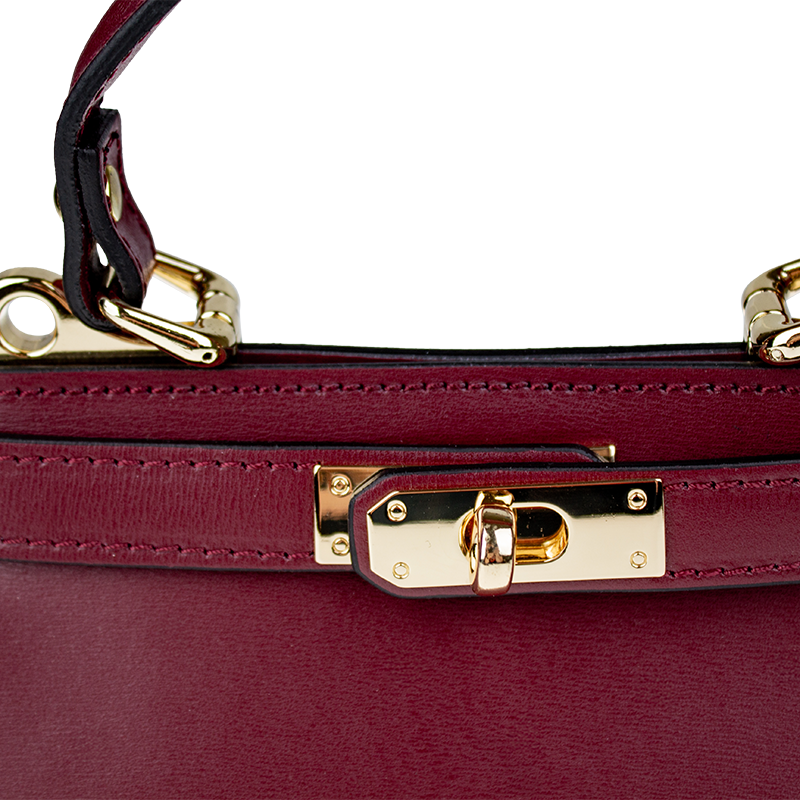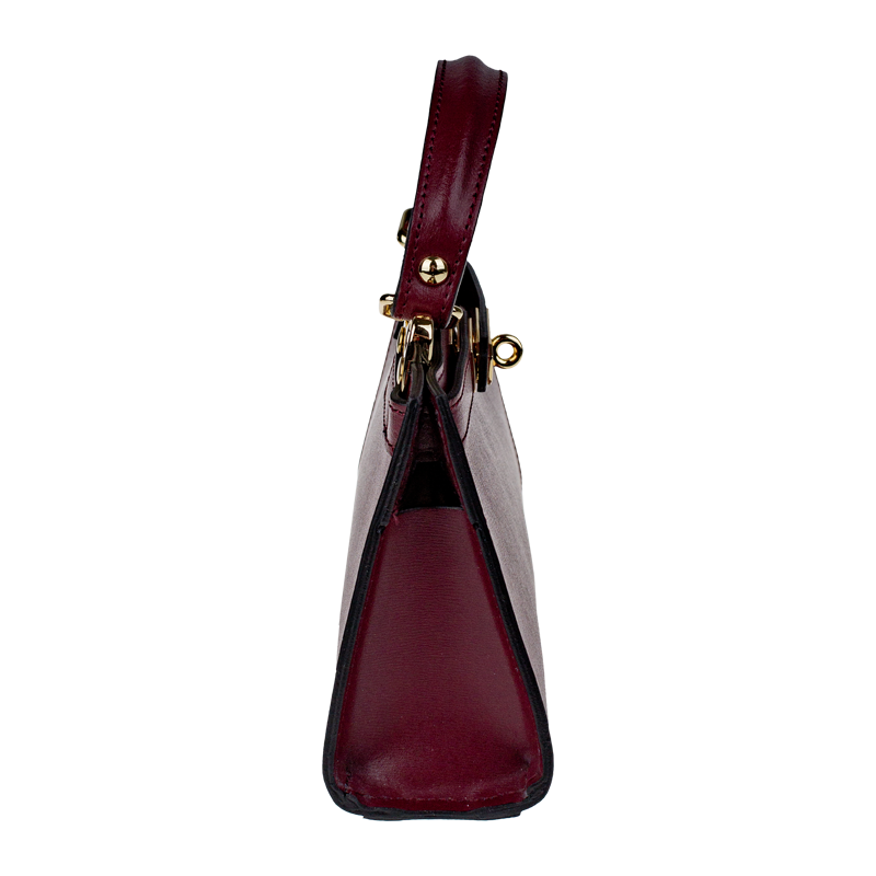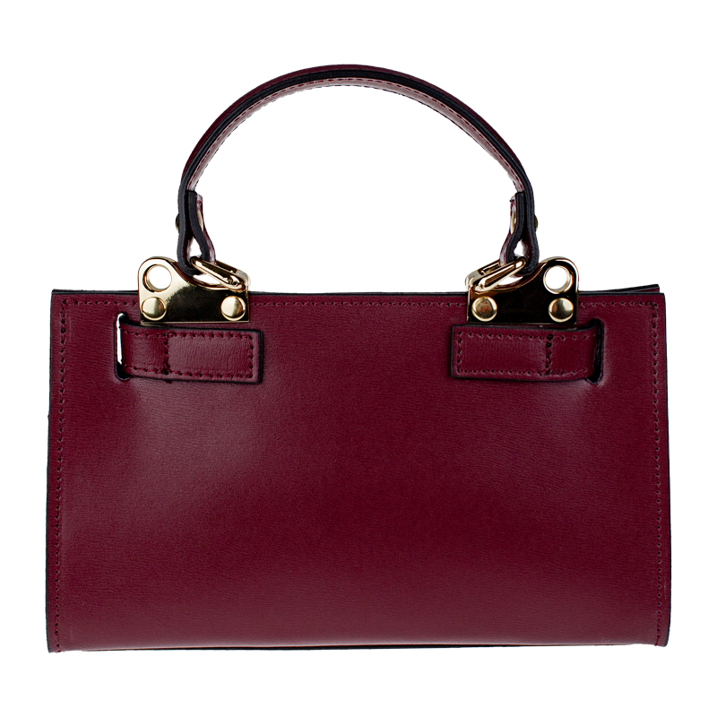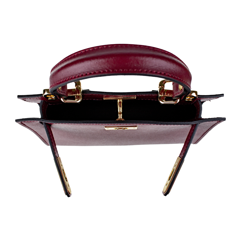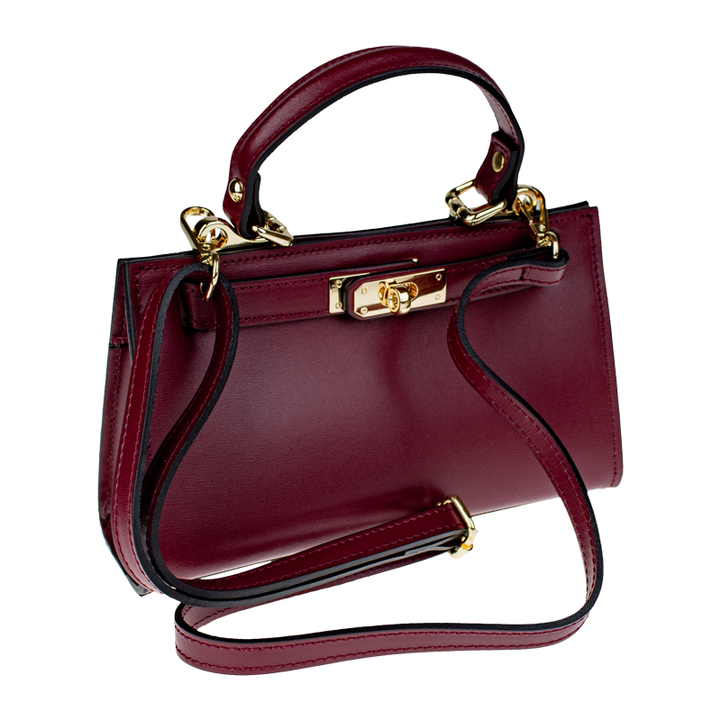 Malá kabelka z pevné kůže v bordó barvě. Kabelku lze nosit v ruce nebo přes rameno. Max. délka přídavného pásku je 115 cm. Kabelka je vybavena důmyslným a elegantním zapínáním. Uvnitř kabelky nalezneme kapsu na mobil či klíče.