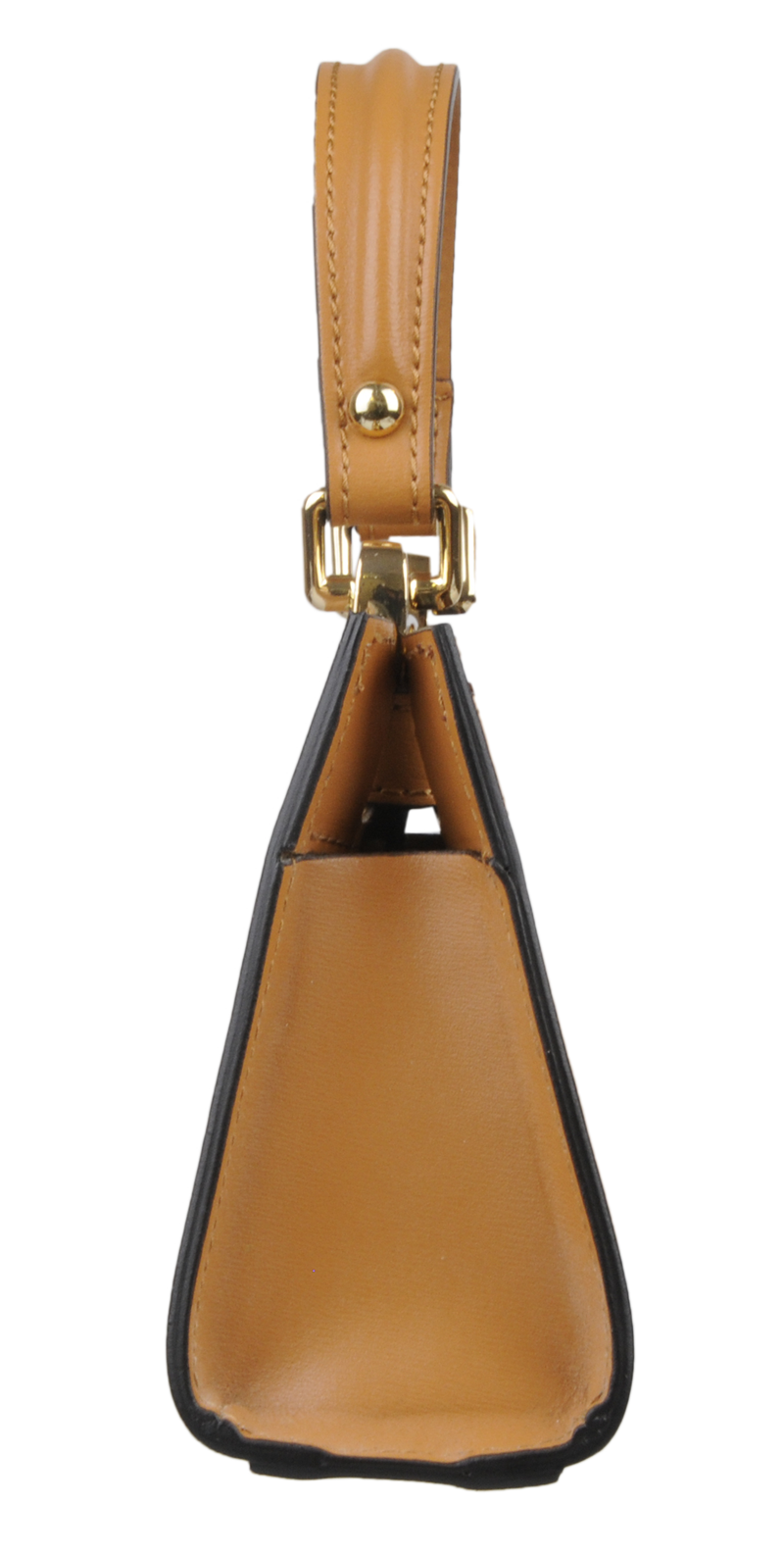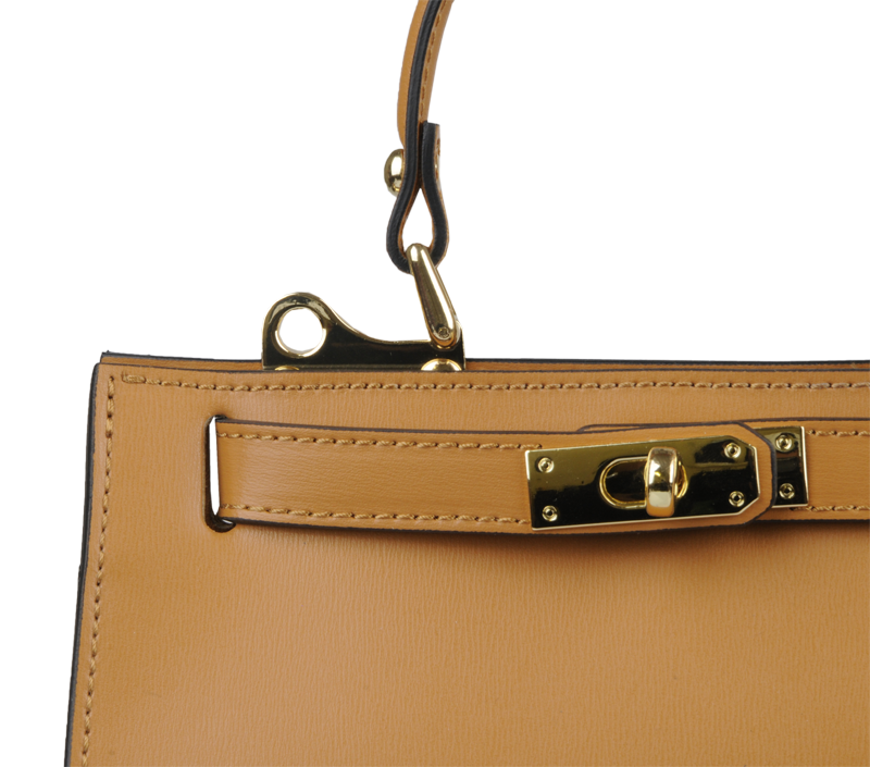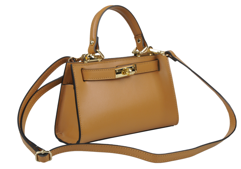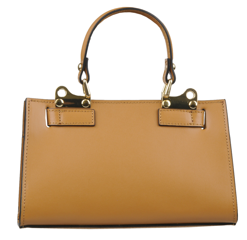 Malá kabelka z pevné kůže v camel barvě. Kabelku lze nosit v ruce nebo přes rameno. Max. délka přídavného pásku je 115 cm. Kabelka je vybavena důmyslným a elegantním zapínáním. Uvnitř kabelky nalezneme kapsu na mobil či klíče.