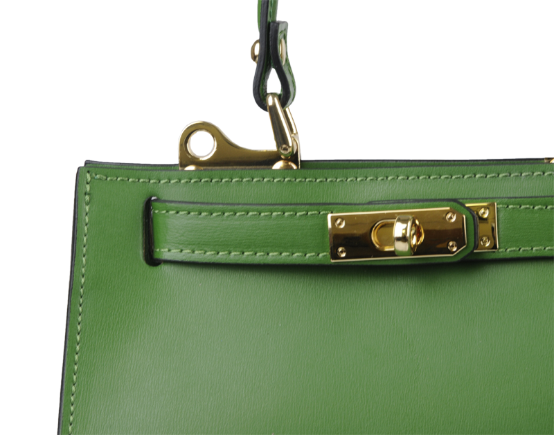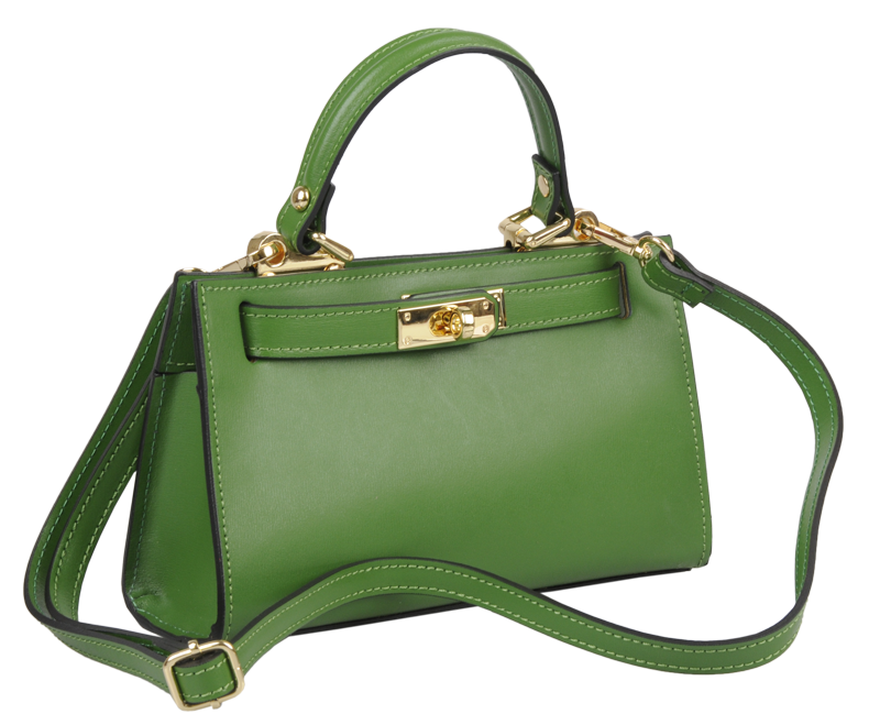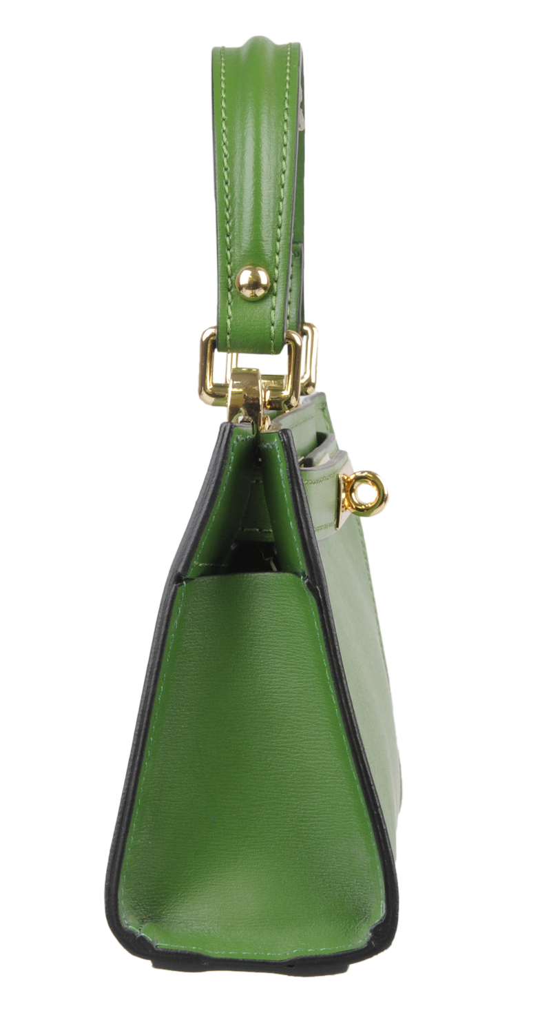 Malá kabelka z pevné kůže v zelené barvě. Kabelku lze nosit v ruce nebo přes rameno. Max. délka přídavného pásku je 115 cm. Kabelka je vybavena důmyslným a elegantním zapínáním. Uvnitř kabelky nalezneme kapsu na mobil či klíče.