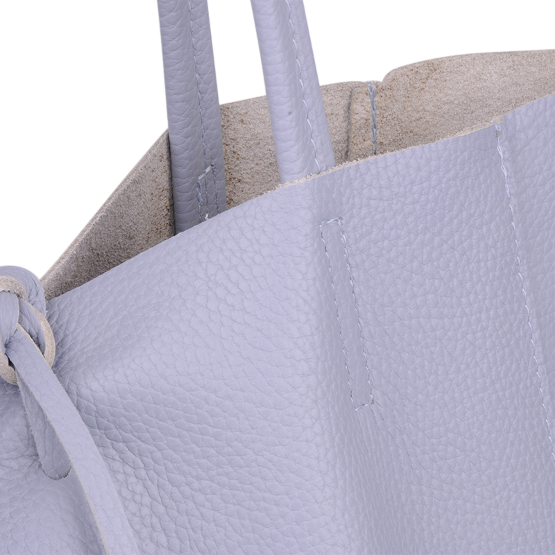 Horní část kabelky lze stáhnout pomocí kožené šňůrky, což dodává šarm a zároveň částečně zajišťuje obsah.