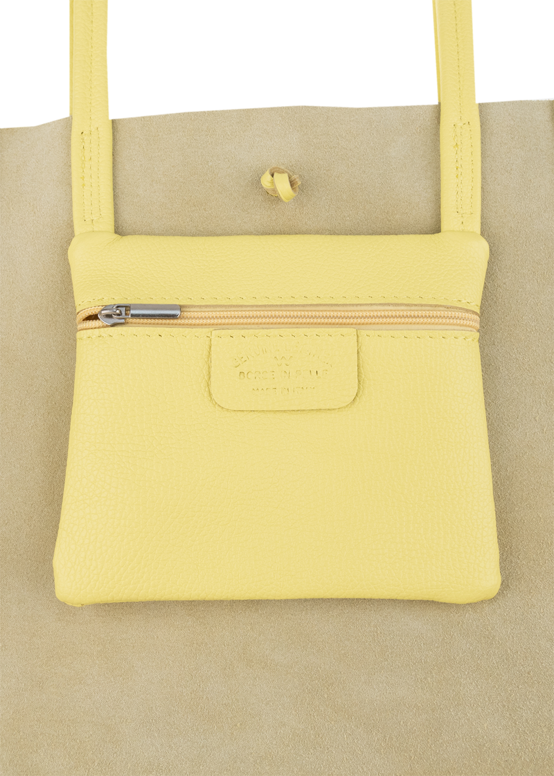 Horní část kabelky lze stáhnout pomocí kožené šňůrky, což dodává šarm a zároveň částečně zajišťuje obsah.