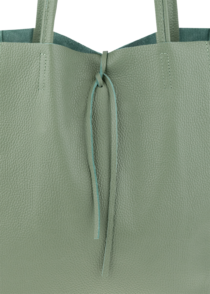 Horní část kabelky lze stáhnout pomocí kožené šňůrky, což dodává šarm a zároveň částečně zajišťuje obsah.