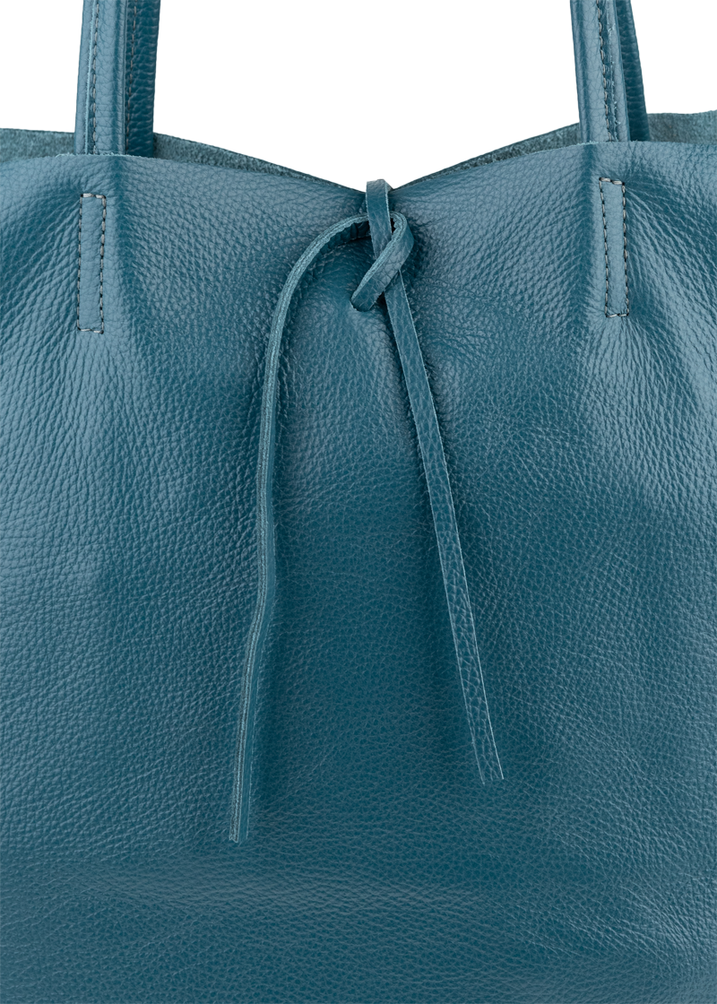 Horní část kabelky lze stáhnout pomocí kožené šňůrky, což dodává šarm a zároveň částečně zajišťuje obsah.