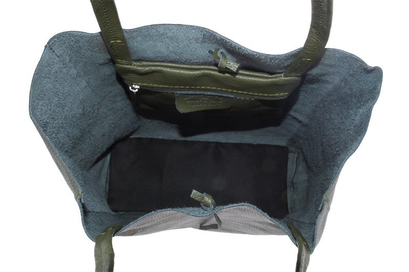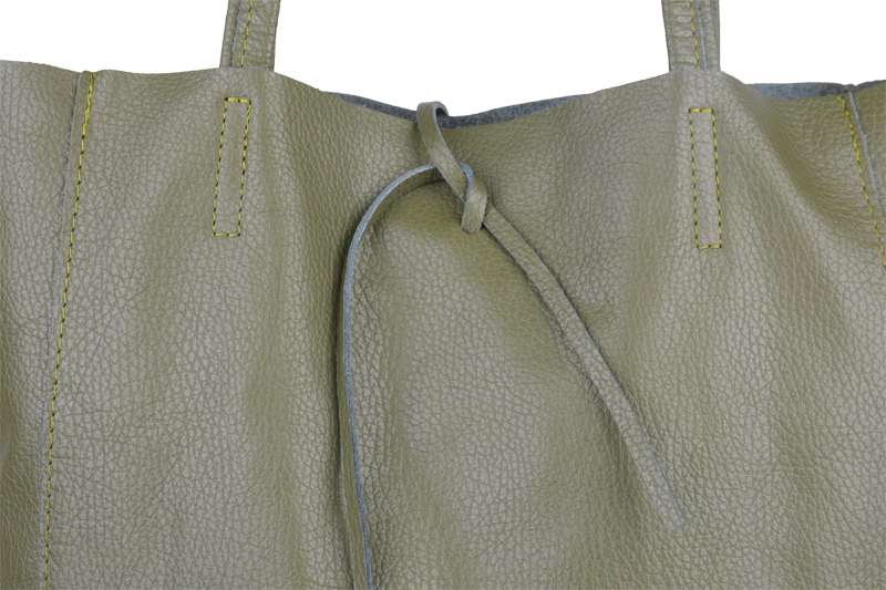 Horní část kabelky lze stáhnout pomocí kožené šňůrky, což dodává šarm a zároveň částečně zajišťuje obsah.
