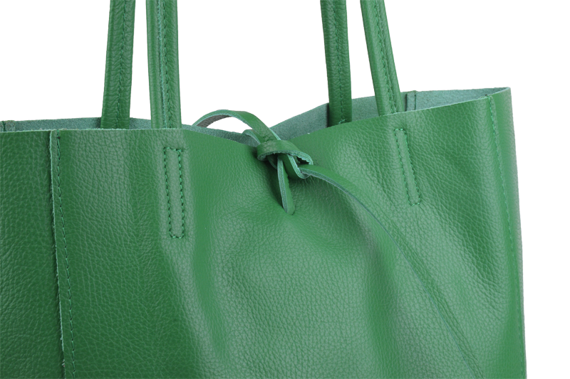 Horní část kabelky lze stáhnout pomocí kožené šňůrky, což dodává šarm a zároveň částečně zajišťuje obsah.