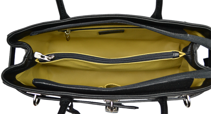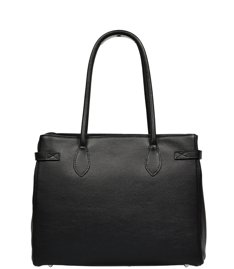 Velká kabelka v černé barvě, nositelná přes rameno s propracovaným designem a dekoračním zámečkem. Tato kožená kabelka je uzavíratelná na zip. Vyrobena z pravé poctivé kůže. Uvnitř disponuje kapsou na zip a 2 malými kapsami vhodnými např. pro Váš mobil a peněženku. Hloubka jejího dna činí 10,5 cm.
