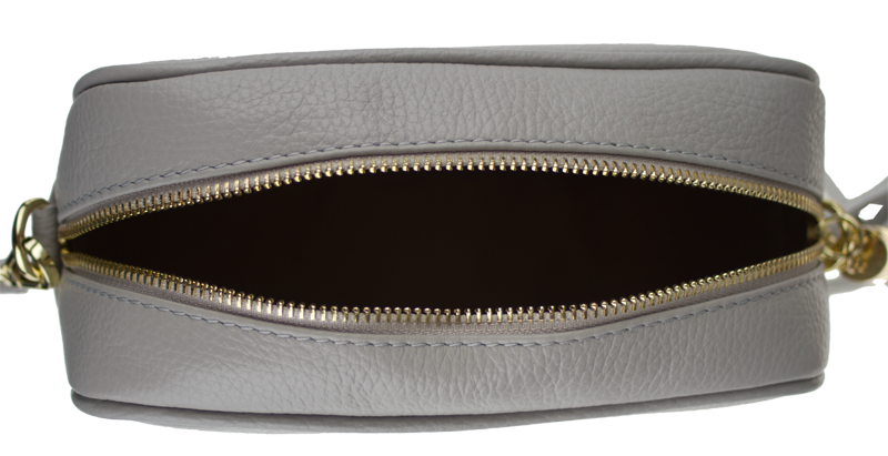 Malá praktická kožená kabelka, kterou lze nosit přes rameno nebo cross-body (křížem). Kabelka se uzavírá pomocí zipu a uvnitř najdeme přihrádku pro vše potřebné.