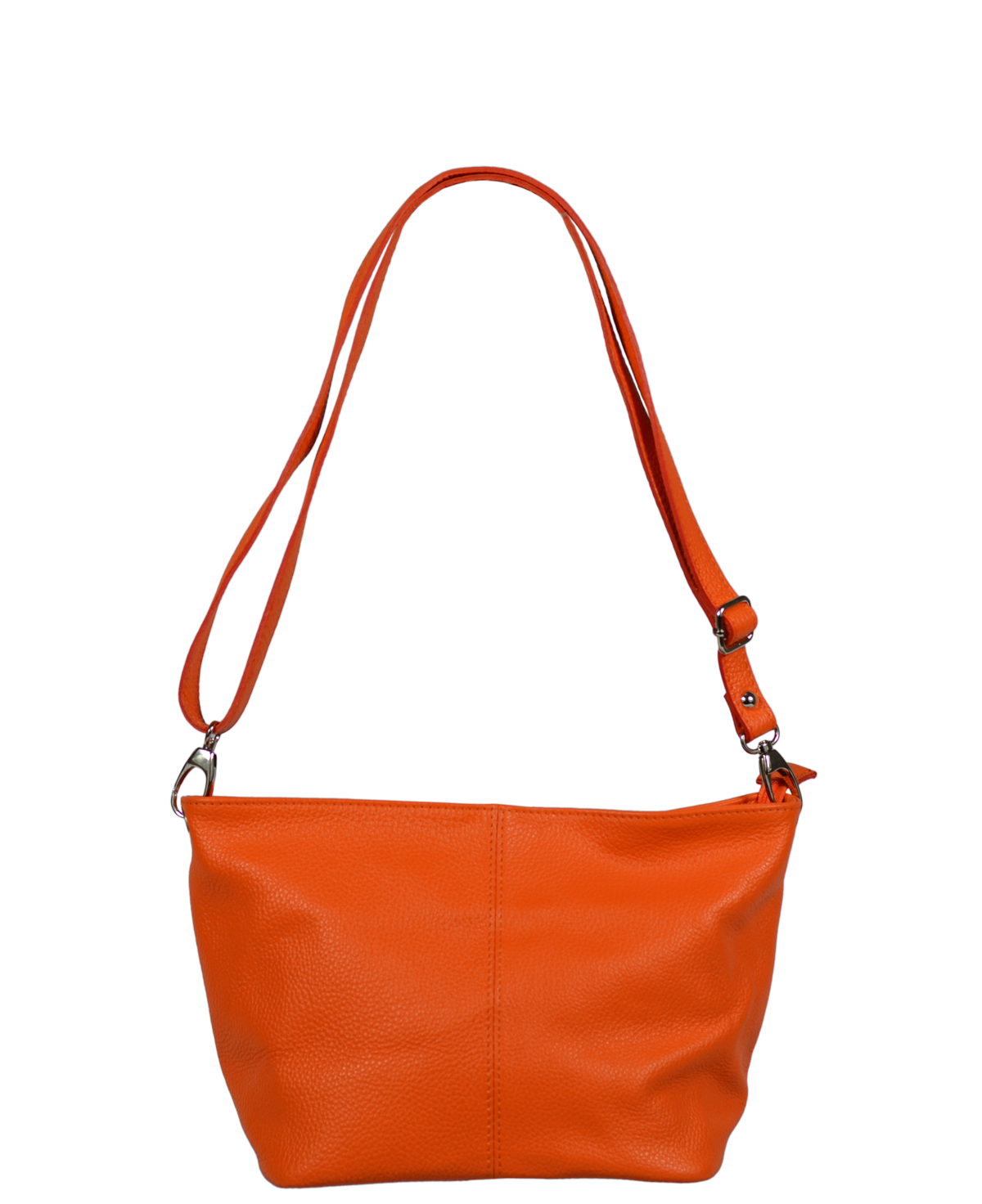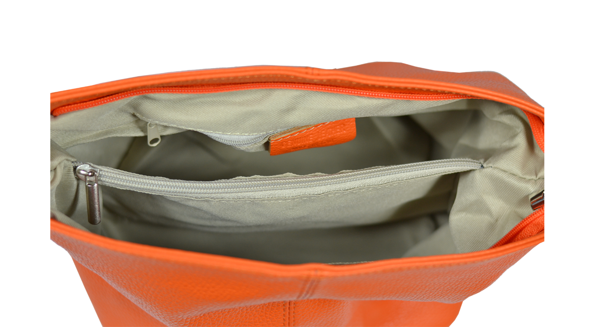 Oranžová kabelka nositelná přes rameno či cross-body (křížem). Tato kožená kabelka je uzavíratelná na zip. Uvnitř kabelky najdeme přepážku uprostřed, která zároveň slouží jako kapsa na zip, a na boční stěně pak kapsu na zip. Hloubka jejího dna je 13 cm. Kabelka má navíc nastavitelný popruh s maximální délkou cca 120 cm.
