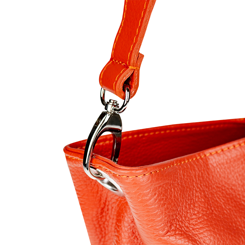 Oranžová kabelka nositelná přes rameno či cross-body (křížem). Tato kožená kabelka je uzavíratelná na zip. Uvnitř kabelky najdeme přepážku uprostřed, která zároveň slouží jako kapsa na zip, a na boční stěně pak kapsu na zip. Hloubka jejího dna je 13 cm. Kabelka má navíc nastavitelný popruh s maximální délkou cca 120 cm.