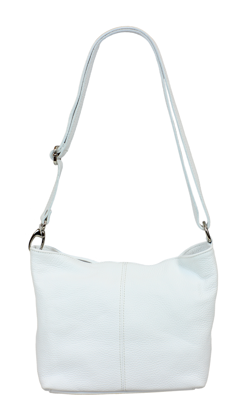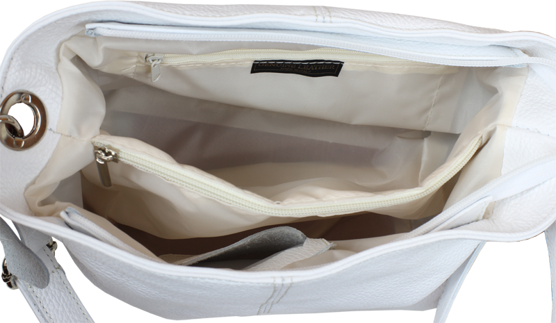 Bílá kabelka nositelná přes rameno či cross-body (křížem). Tato kožená kabelka je uzavíratelná na zip. Uvnitř kabelky najdeme přepážku uprostřed, která zároveň slouží jako kapsa na zip, a na boční stěně pak kapsu na zip. Hloubka jejího dna je 13 cm.