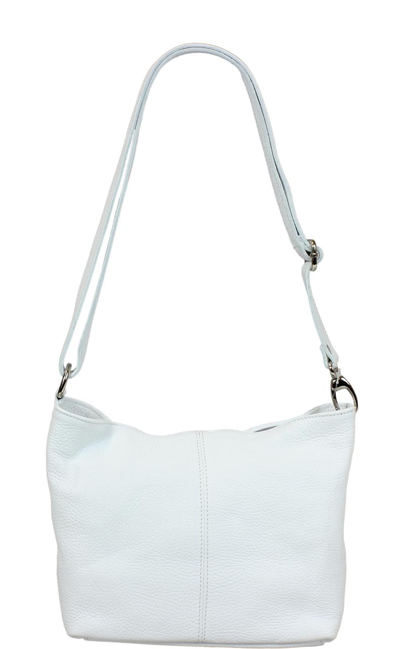 Bílá kabelka nositelná přes rameno či cross-body (křížem). Tato kožená kabelka je uzavíratelná na zip. Uvnitř kabelky najdeme přepážku uprostřed, která zároveň slouží jako kapsa na zip, a na boční stěně pak kapsu na zip. Hloubka jejího dna je 13 cm. Kabelka má navíc nastavitelný popruh s maximální délkou cca 120 cm.