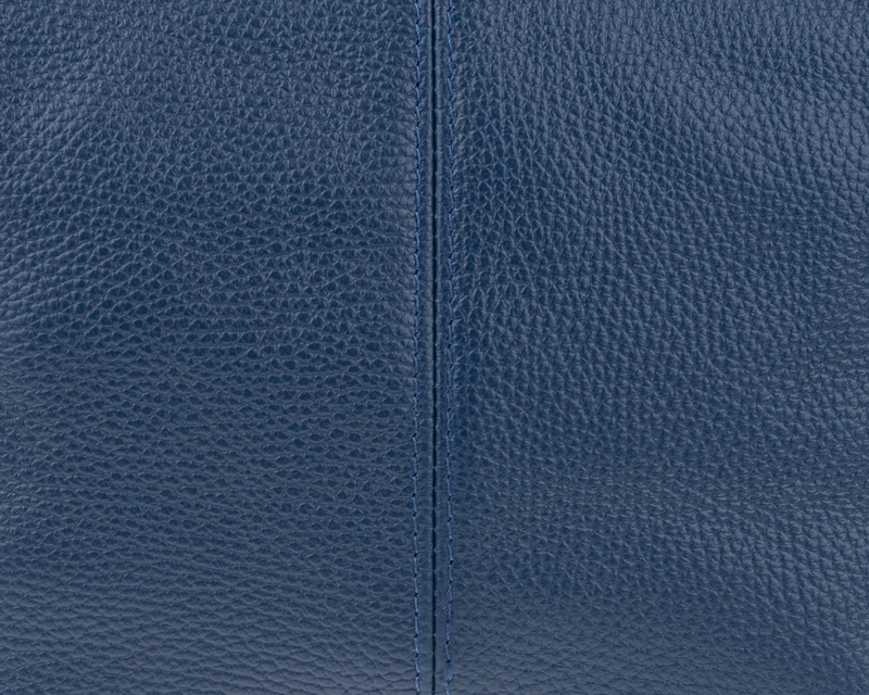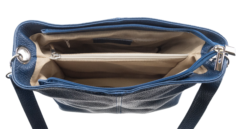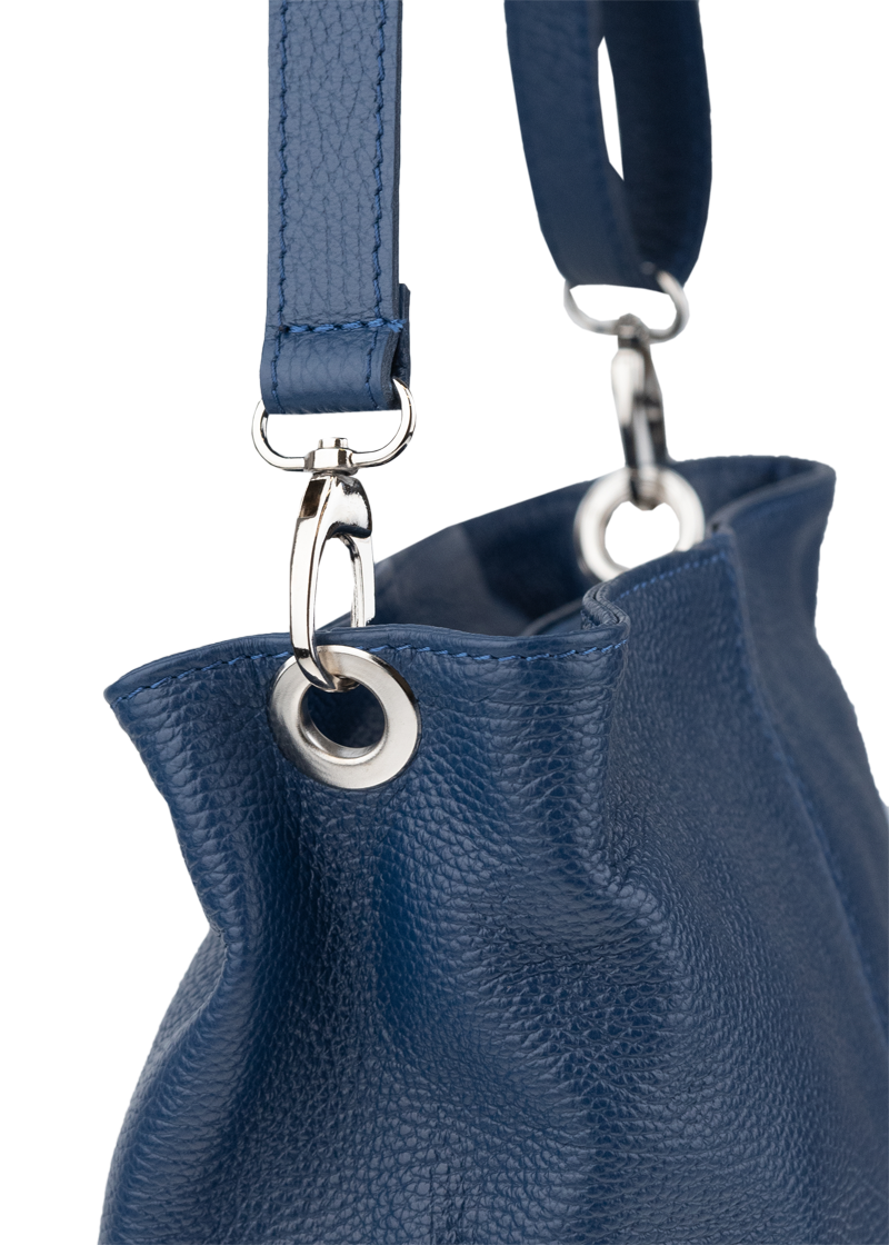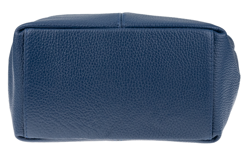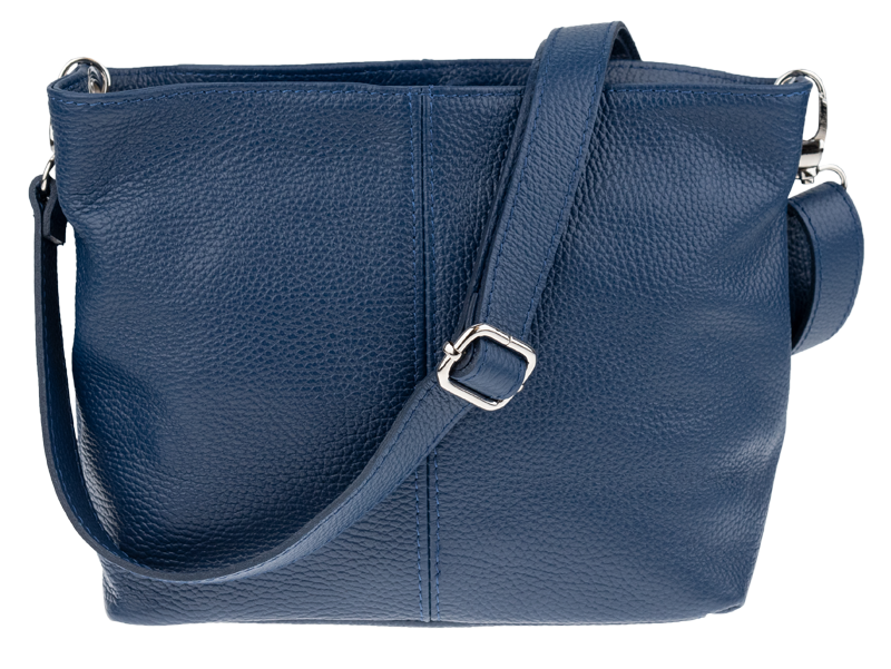 Modrá kabelka nositelná přes rameno či cross-body (křížem). Tato kožená kabelka je uzavíratelná na zip. Uvnitř kabelky najdeme přepážku uprostřed, která zároveň slouží jako kapsa na zip, a na boční stěně pak kapsu na zip. Hloubka jejího dna je 13 cm. Kabelka má navíc nastavitelný popruh s maximální délkou cca 120 cm.
