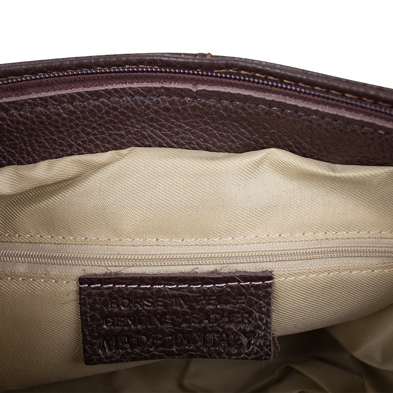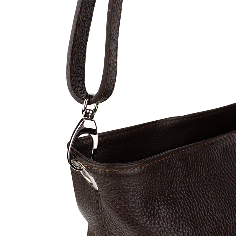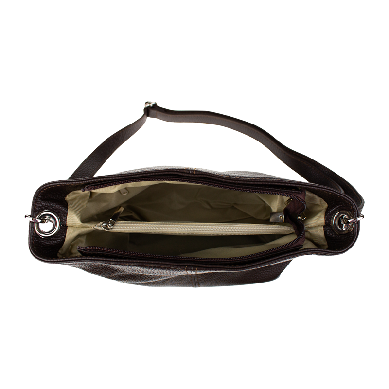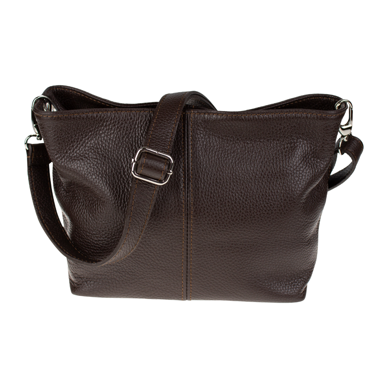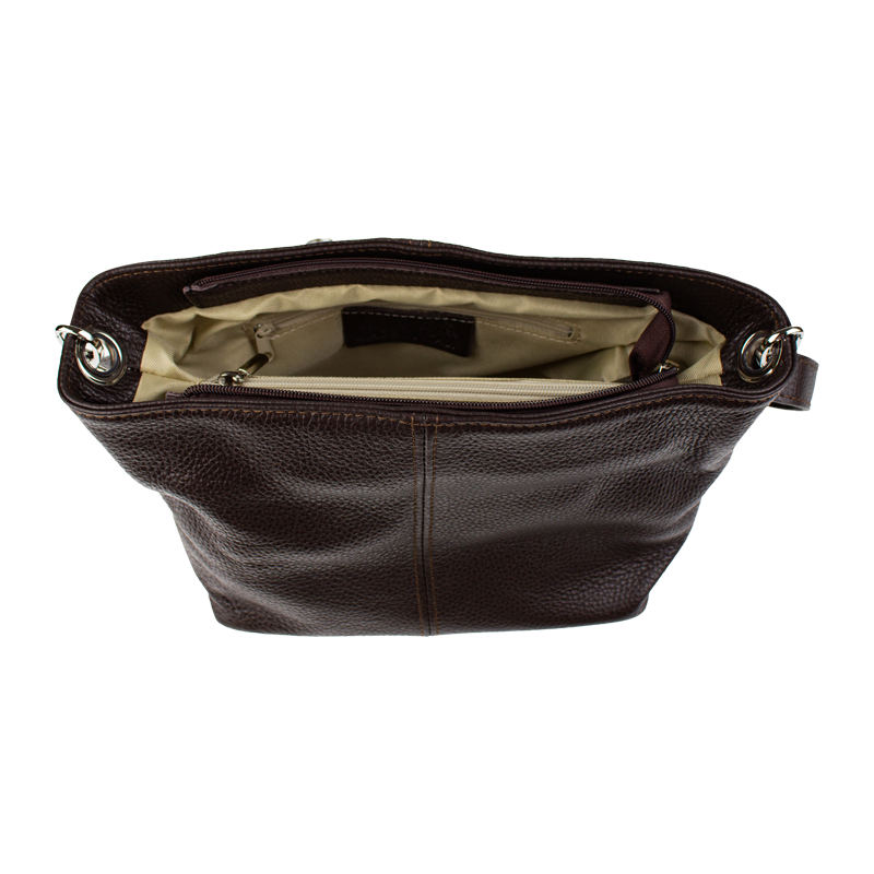 Kabelka nositelná přes rameno či cross-body (křížem). Hnědá kožená kabelka je uzavíratelná na zip. Uvnitř kabelky najdeme přepážku uprostřed, která zároveň slouží jako kapsa na zip, a na boční stěně pak kapsu na zip. Hloubka jejího dna je 13 cm. Kabelka má navíc nastavitelný popruh s maximální délkou cca 120 cm.