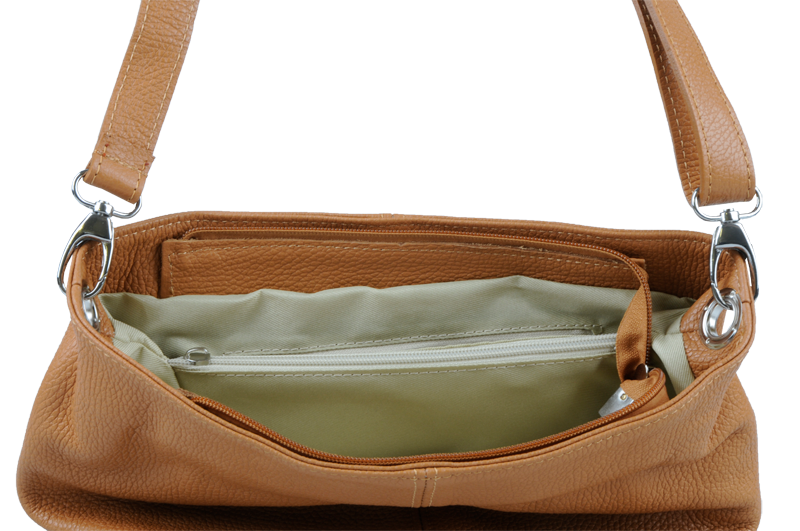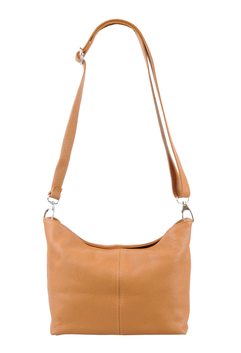 Kabelka nositelná přes rameno či cross-body (křížem) v moderní camel barvě. Tato kožená kabelka je uzavíratelná na zip. Uvnitř kabelky najdeme přepážku uprostřed, která zároveň slouží jako kapsa na zip, a na boční stěně pak kapsu na zip. Hloubka jejího dna je 13 cm. Kabelka má navíc nastavitelný popruh s maximální délkou cca 120 cm.