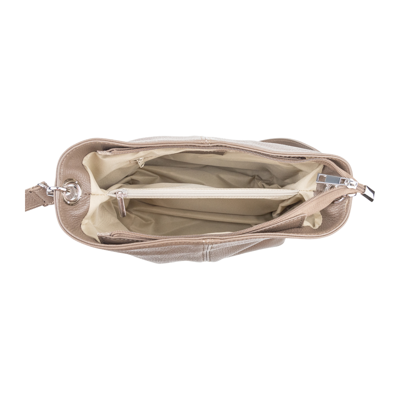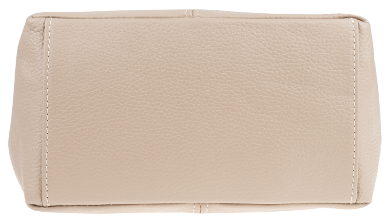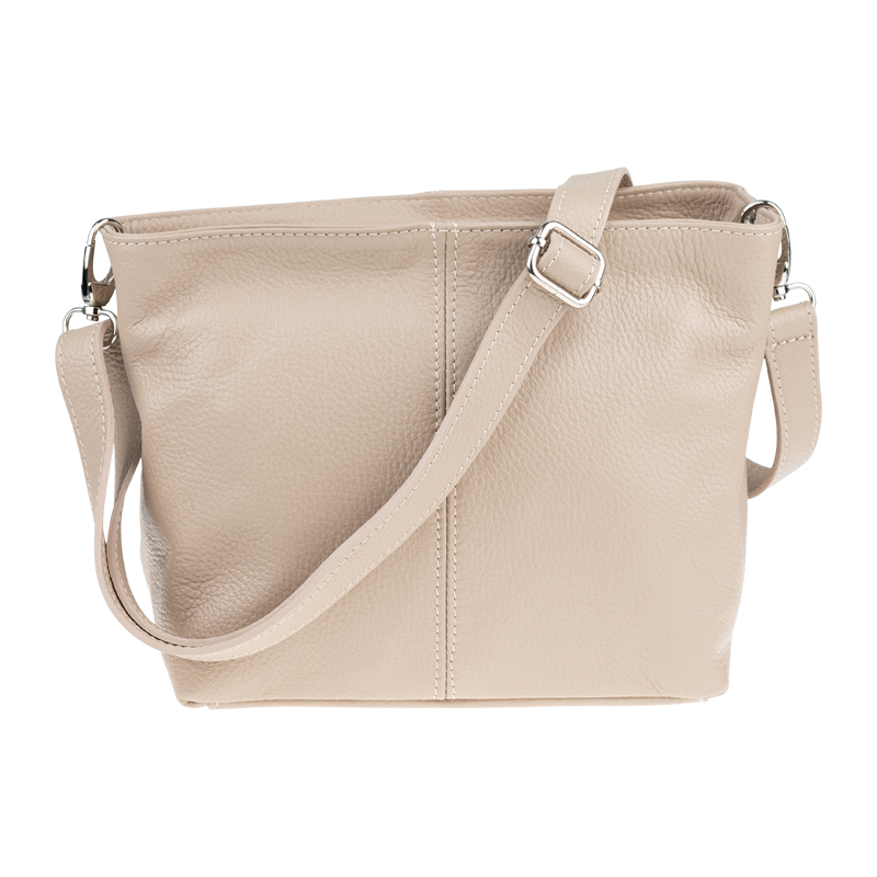Béžová kabelka nositelná přes rameno či cross-body (křížem). Tato kožená kabelka je uzavíratelná na zip. Uvnitř kabelky najdeme přepážku uprostřed, která zároveň slouží jako kapsa na zip, a na boční stěně pak kapsu na zip. Hloubka jejího dna je 13 cm. Kabelka má navíc nastavitelný popruh s maximální délkou cca 120 cm.