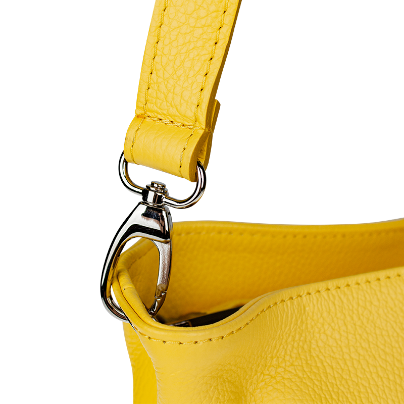 Kanárkově žlutá kabelka nositelná přes rameno či cross-body (křížem). Tato kožená kabelka je uzavíratelná na zip. Uvnitř kabelky najdeme přepážku uprostřed, která zároveň slouží jako kapsa na zip, a na boční stěně pak kapsu na zip. Hloubka jejího dna je 13 cm. Kabelka má navíc nastavitelný popruh s maximální délkou cca 120 cm.