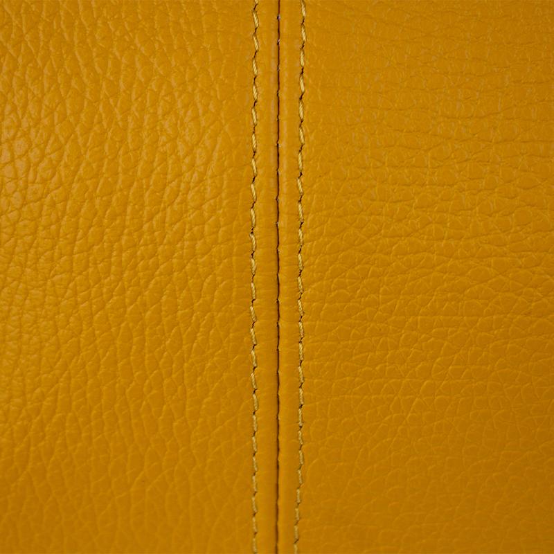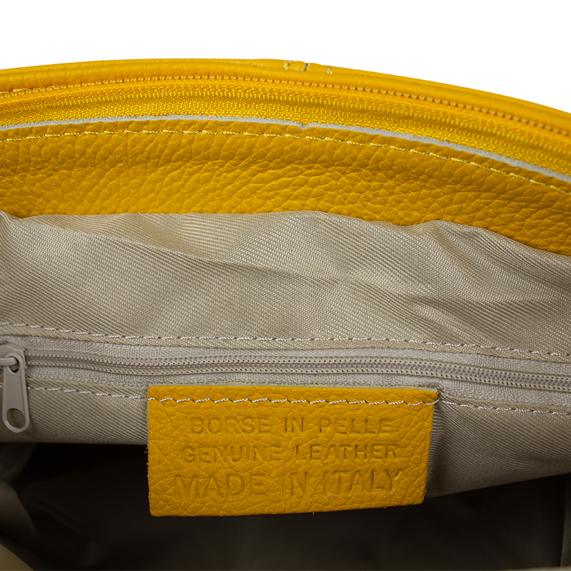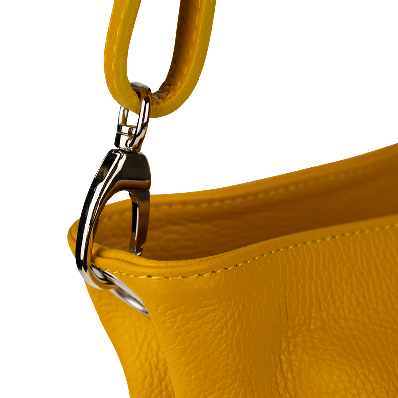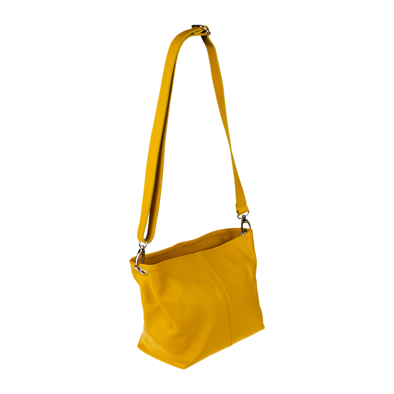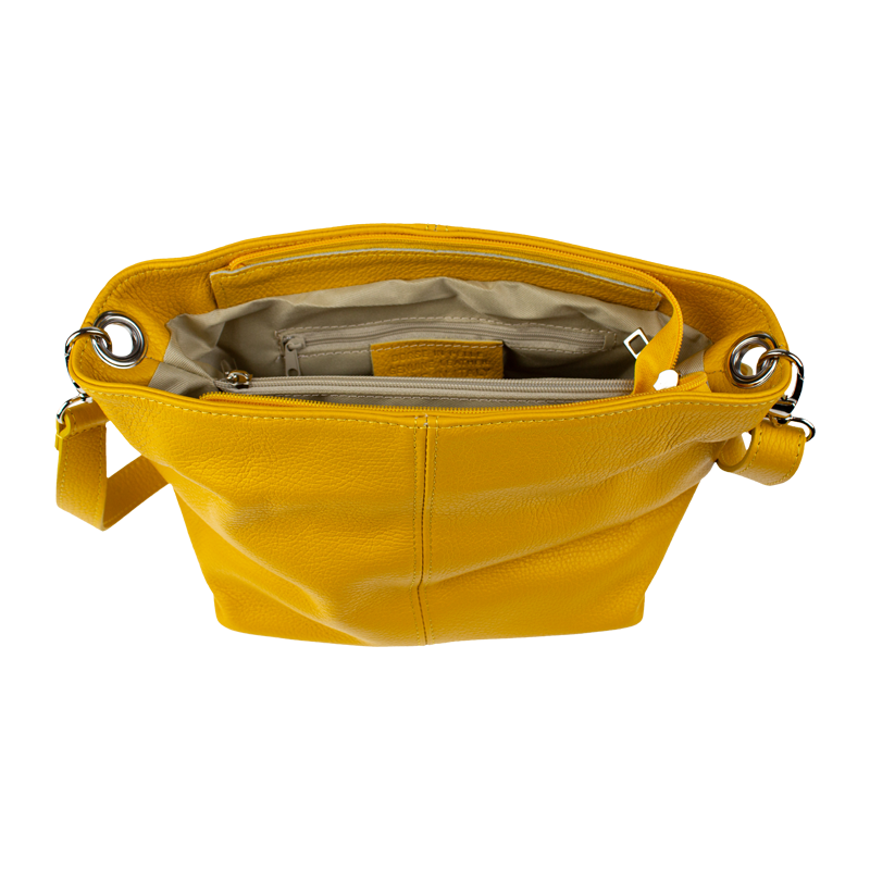 Žlutá kabelka nositelná přes rameno či cross-body (křížem). Tato kožená kabelka je uzavíratelná na zip. Uvnitř kabelky najdeme přepážku uprostřed, která zároveň slouží jako kapsa na zip, a na boční stěně pak kapsu na zip. Hloubka jejího dna je 13 cm. Kabelka má navíc nastavitelný popruh s maximální délkou cca 120 cm.
