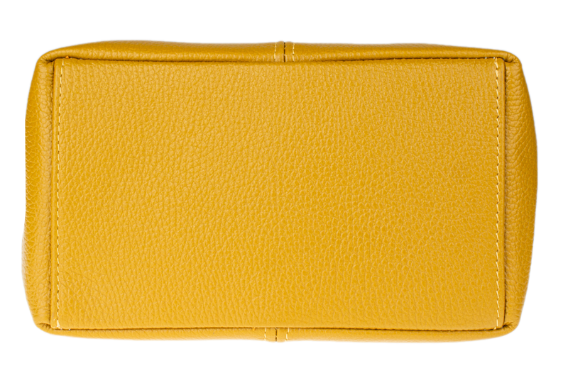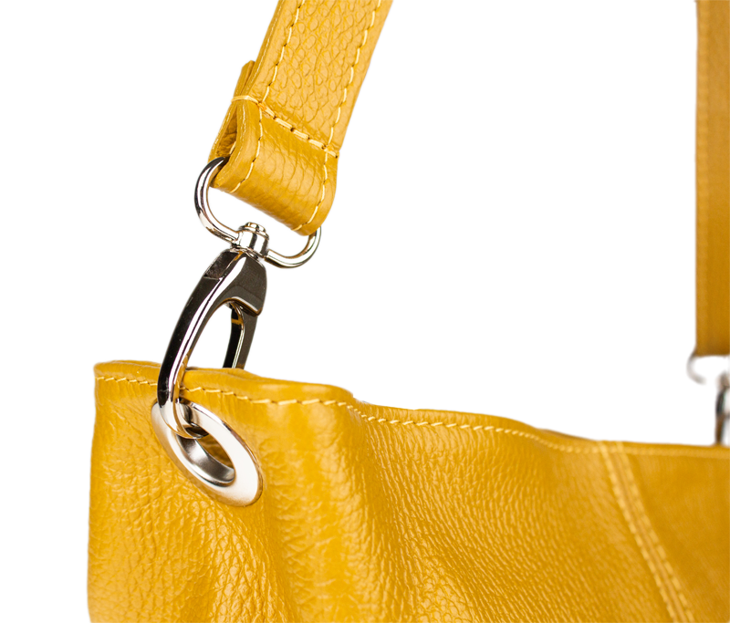 Žlutá kabelka nositelná přes rameno či cross-body (křížem). Tato kožená kabelka je uzavíratelná na zip. Uvnitř kabelky najdeme přepážku uprostřed, která zároveň slouží jako kapsa na zip, a na boční stěně pak kapsu na zip. Hloubka jejího dna je 13 cm. Kabelka má navíc nastavitelný popruh s maximální délkou cca 120 cm.