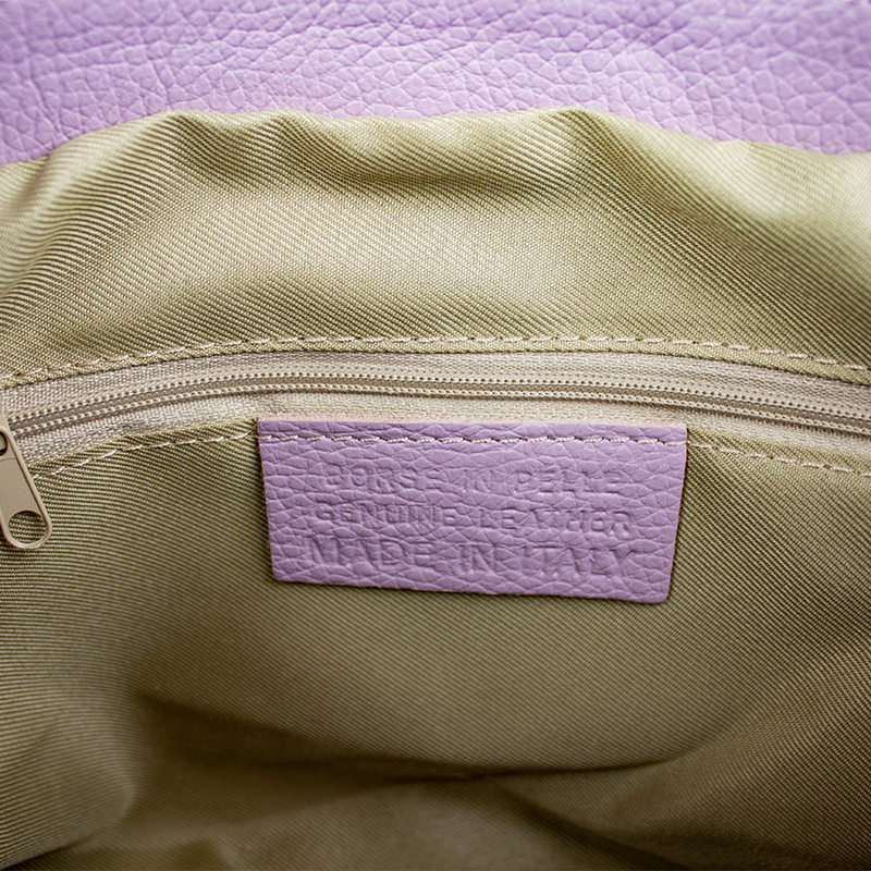 Fialová kabelka nositelná přes rameno či cross-body (křížem). Tato kožená kabelka je uzavíratelná na zip. Uvnitř kabelky najdeme přepážku uprostřed, která zároveň slouží jako kapsa na zip, a na boční stěně pak kapsu na zip. Hloubka jejího dna je 13 cm. Kabelka má navíc nastavitelný popruh s maximální délkou cca 120 cm.