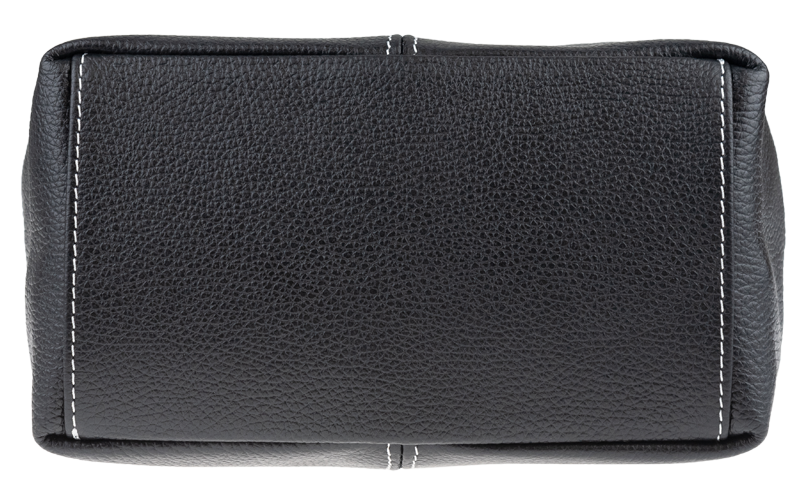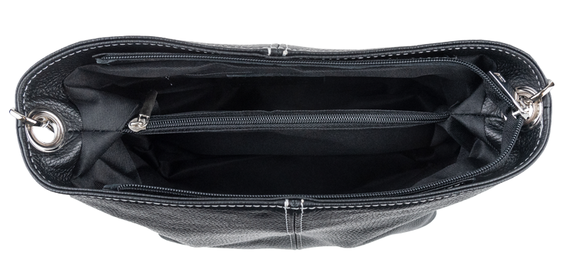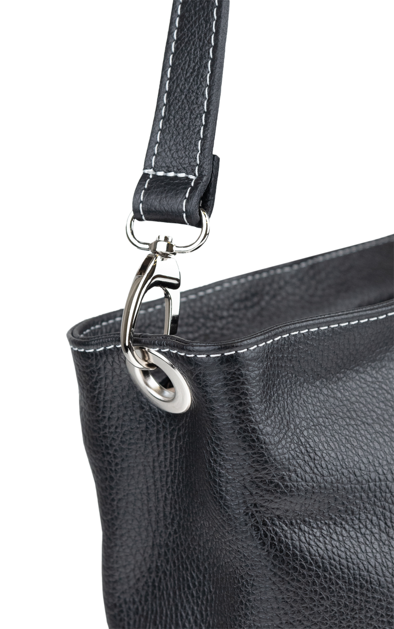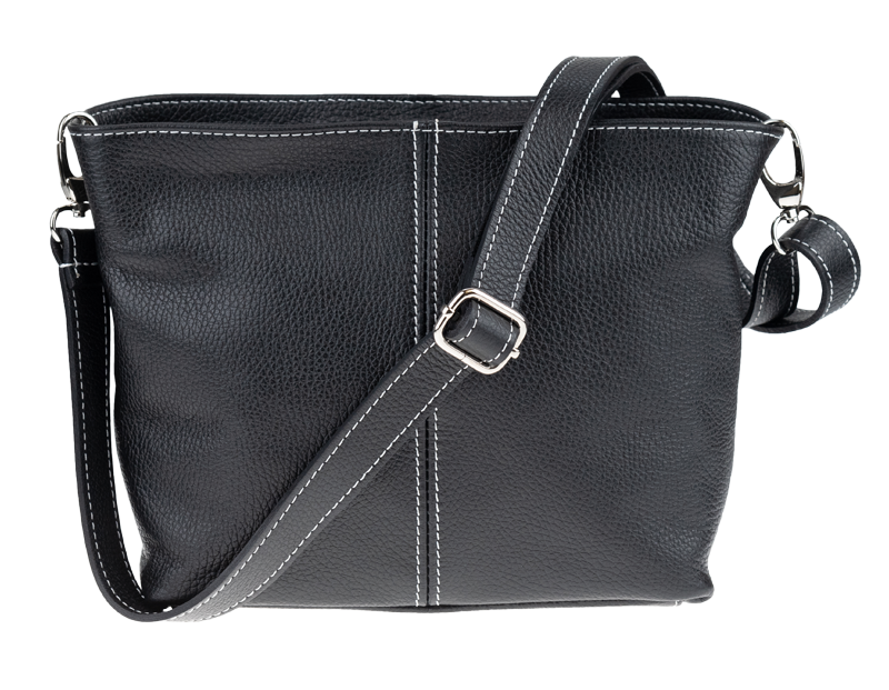 Černá kabelka nositelná přes rameno či cross-body (křížem). Tato kožená kabelka je uzavíratelná na zip. Uvnitř kabelky najdeme přepážku uprostřed, která zároveň slouží jako kapsa na zip, a na boční stěně pak kapsu na zip. Hloubka jejího dna je 13 cm. Kabelka má navíc nastavitelný popruh s maximální délkou cca 120 cm.