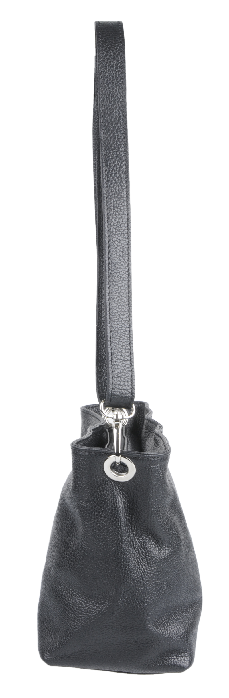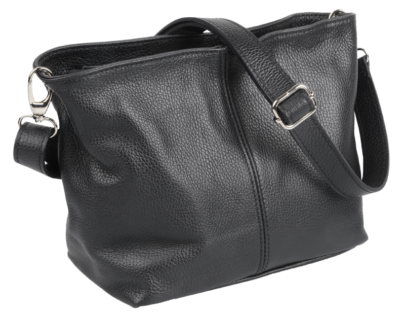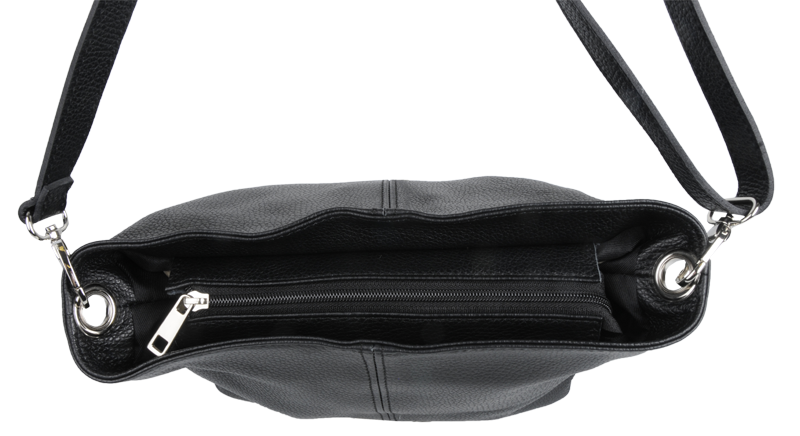 Černá kabelka nositelná přes rameno či cross-body (křížem). Tato kožená kabelka je uzavíratelná na zip. Uvnitř kabelky najdeme přepážku uprostřed, která zároveň slouží jako kapsa na zip, a na boční stěně pak kapsu na zip. Hloubka jejího dna je 13 cm. Kabelka má navíc nastavitelný popruh s maximální délkou cca 120 cm.