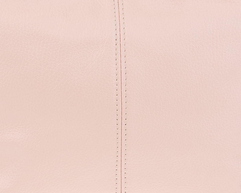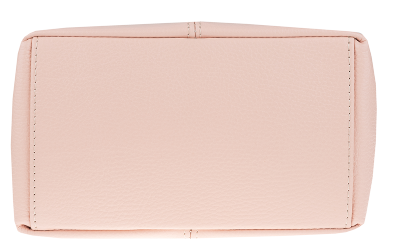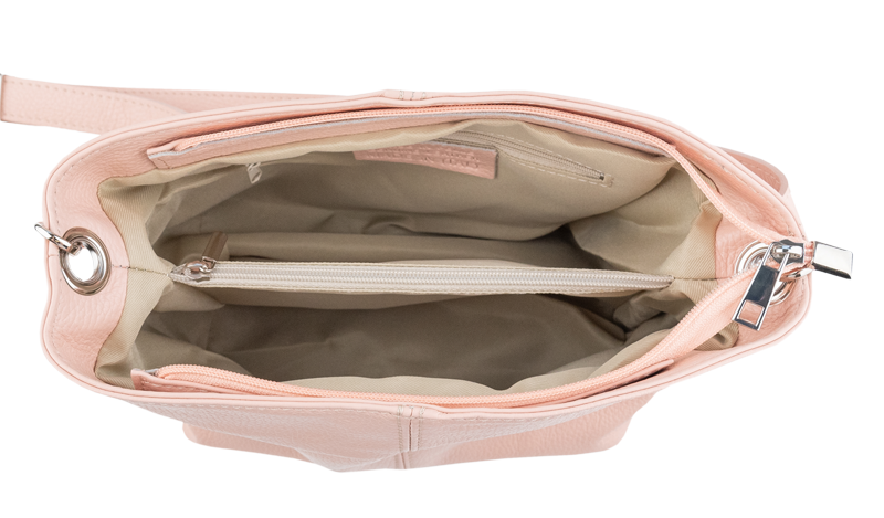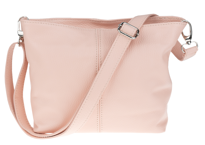 Růžová kabelka nositelná přes rameno či cross-body (křížem). Tato kožená kabelka je uzavíratelná na zip. Uvnitř kabelky najdeme přepážku uprostřed, která zároveň slouží jako kapsa na zip, a na boční stěně pak kapsu na zip. Hloubka jejího dna je 13 cm. Kabelka má navíc nastavitelný popruh s maximální délkou cca 120 cm.