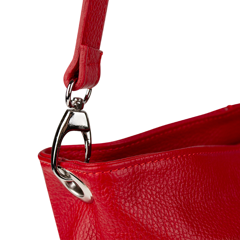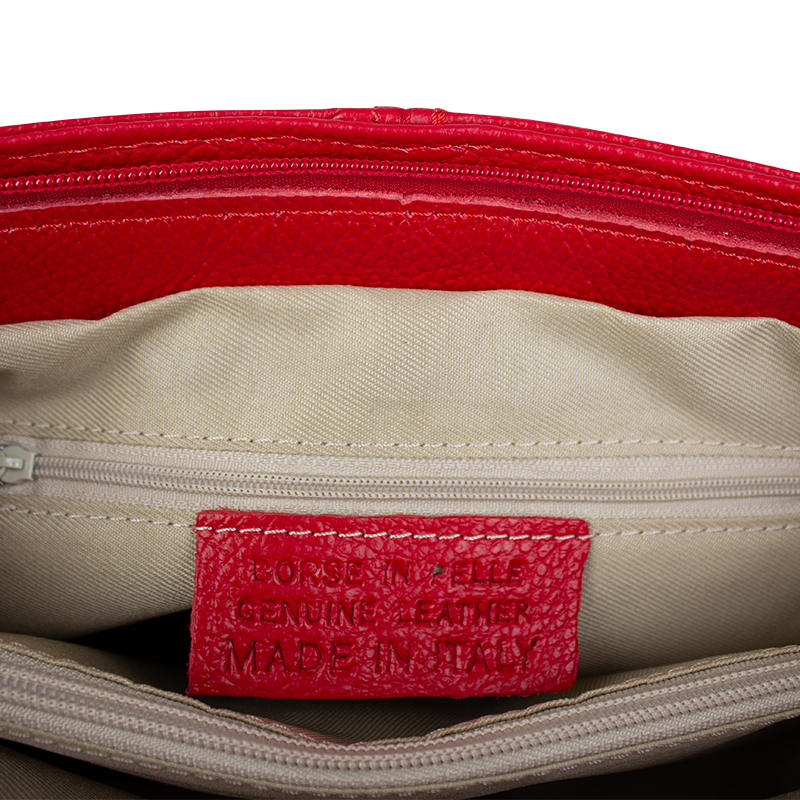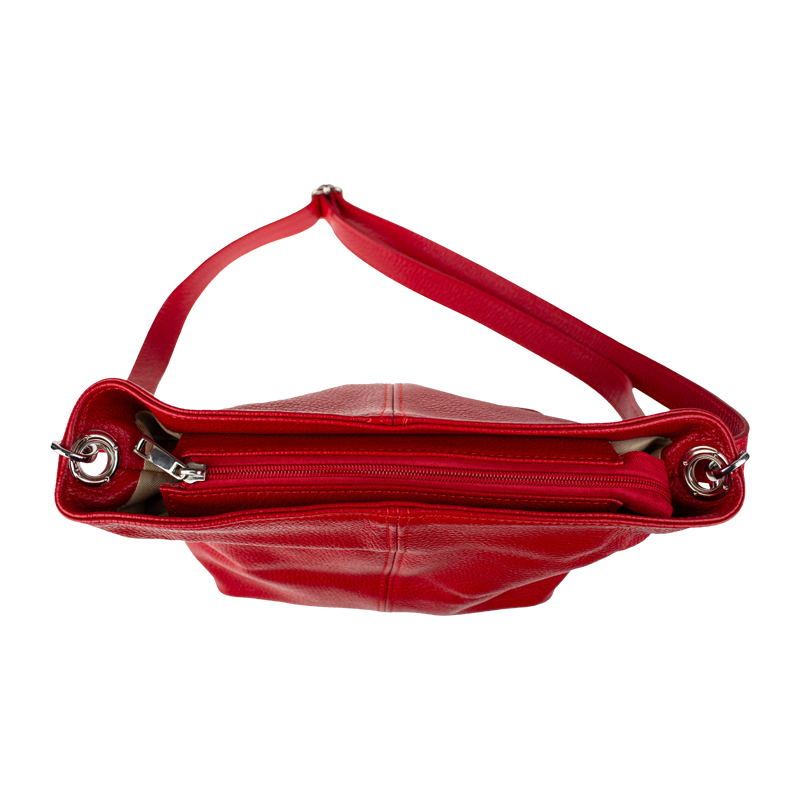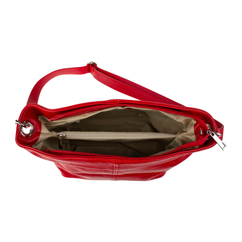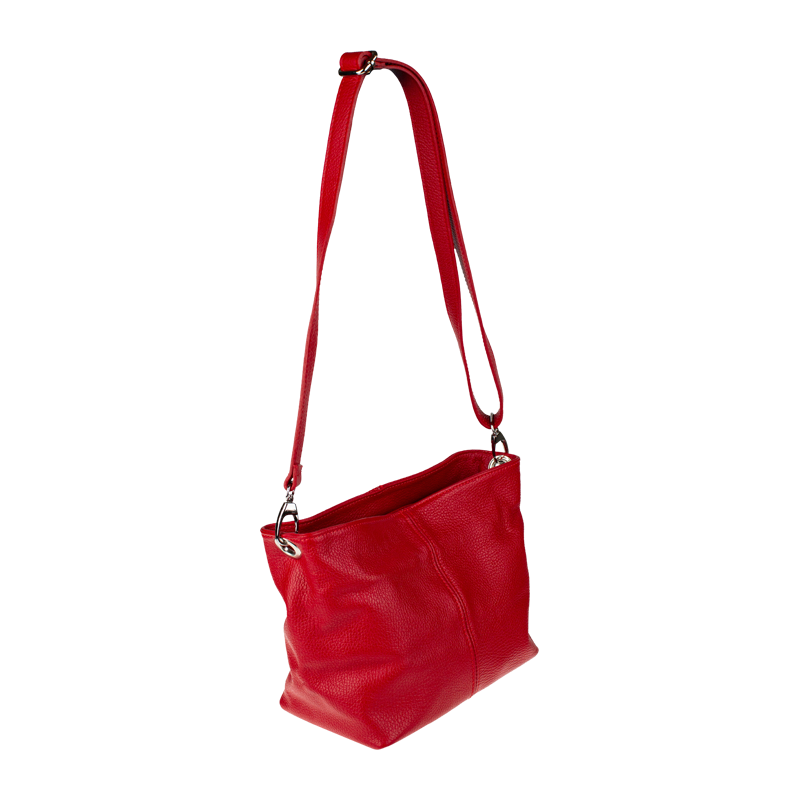 Červená kabelka nositelná přes rameno či cross-body (křížem). Tato kožená kabelka je uzavíratelná na zip. Uvnitř kabelky najdeme přepážku uprostřed, která zároveň slouží jako kapsa na zip, a na boční stěně pak kapsu na zip. Hloubka jejího dna je 13 cm. Kabelka má navíc nastavitelný popruh s maximální délkou cca 120 cm.