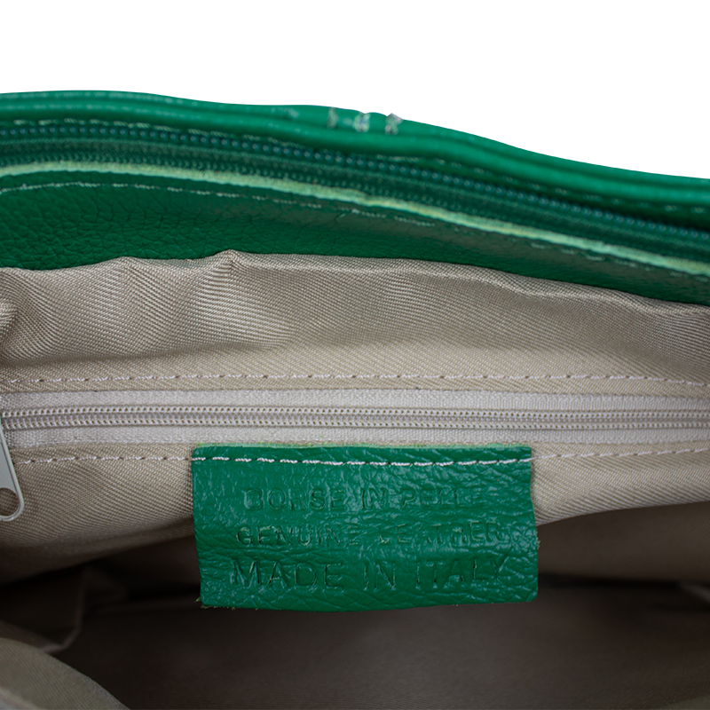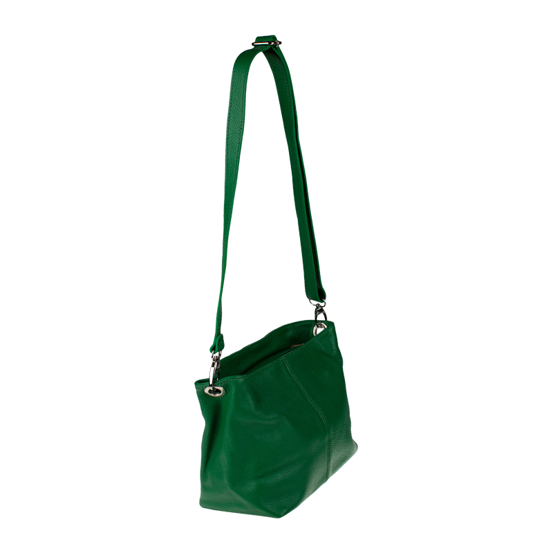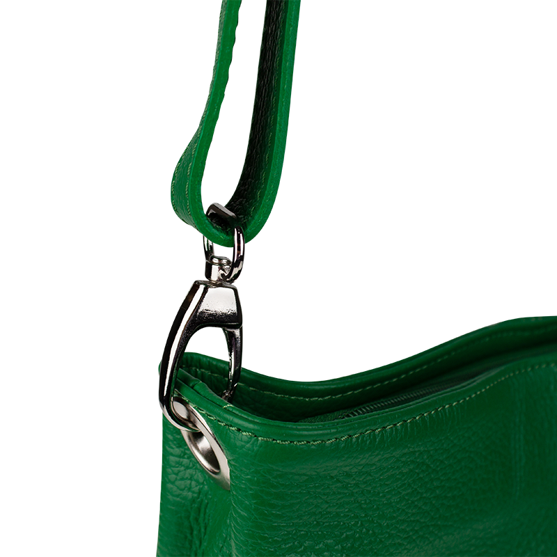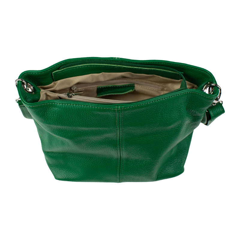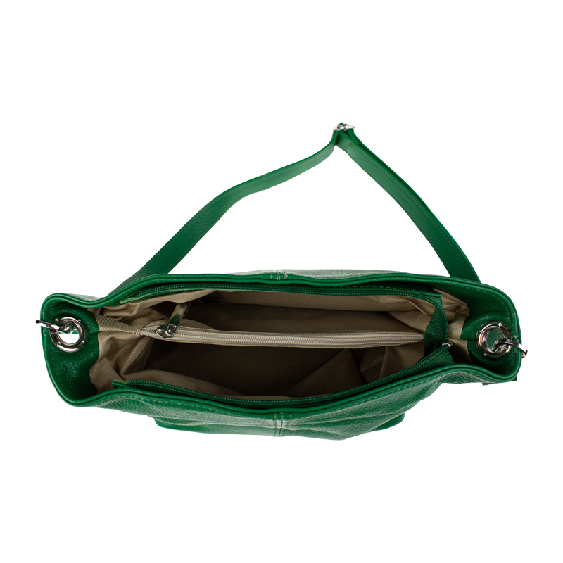 Zelená kabelka nositelná přes rameno či cross-body (křížem). Tato kožená kabelka je uzavíratelná na zip. Uvnitř kabelky najdeme přepážku uprostřed, která zároveň slouží jako kapsa na zip, a na boční stěně pak kapsu na zip. Hloubka jejího dna je 13 cm. Kabelka má navíc nastavitelný popruh s maximální délkou cca 120 cm.