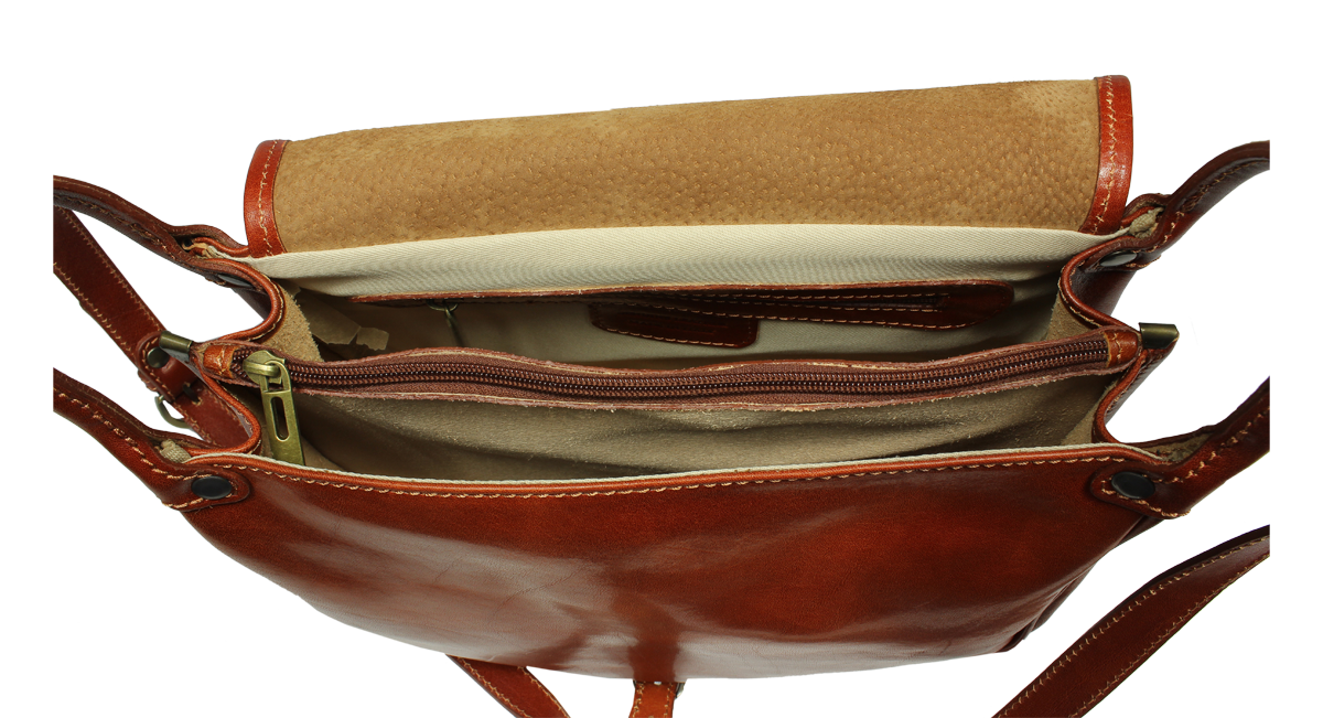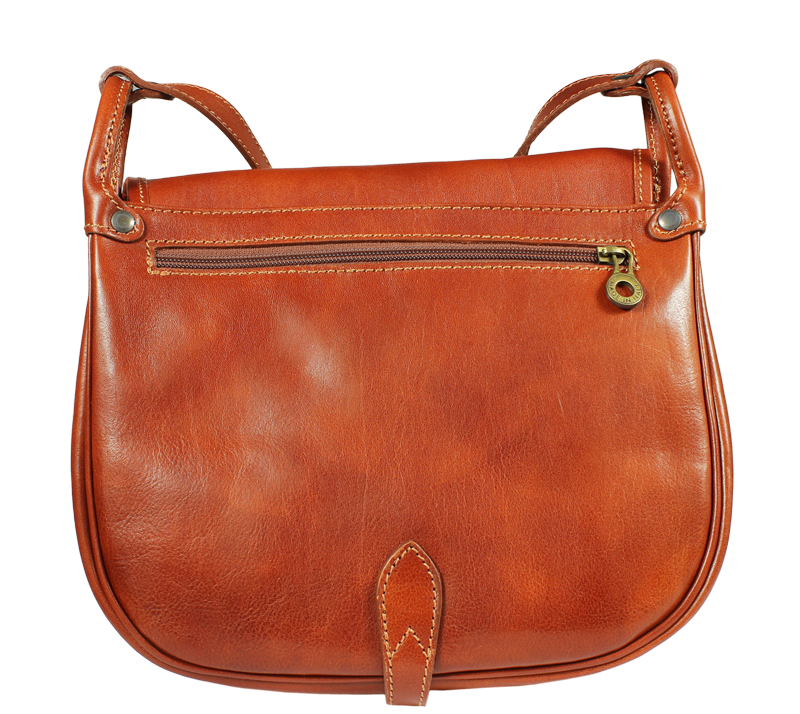 Speciální kabelka s klasickým loveckým designem, v hnědé barvě, uzavíratelná pomocí důmyslného poklopu na patentky – jeho pásek je pouze ozdobou. Nosí se přes rameno nebo cross-body (křížem). Uvnitř kabelky najdeme přepážku uprostřed, která zároveň slouží jako kapsa na zip, a na bočních stěnách pak kapsu na zip a na druhé straně další malou kapsu. Kabelka má k tomu všemu navíc kapsu na zip na vnější zadní straně. Max. délka popruhu je 120 cm.