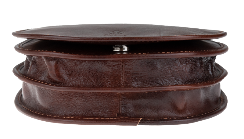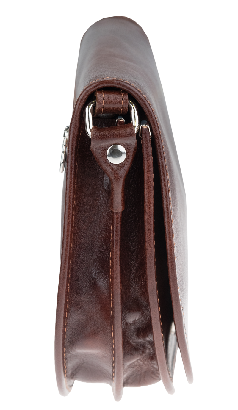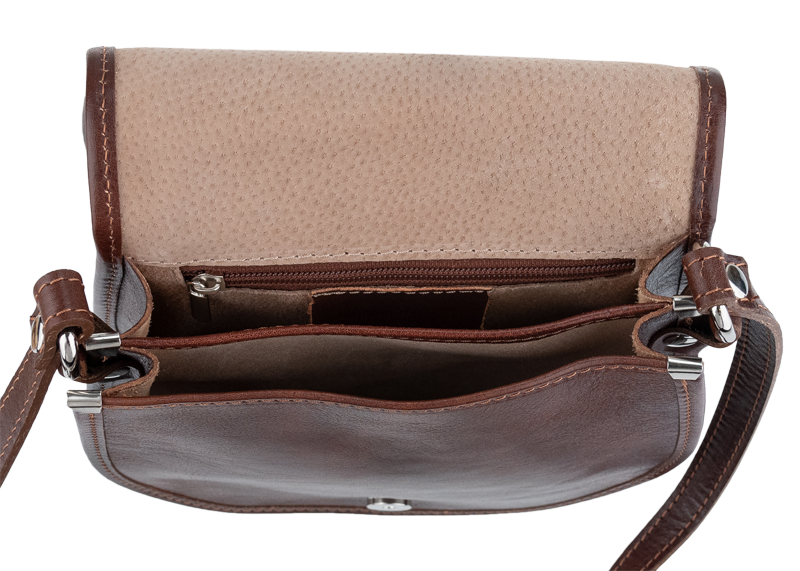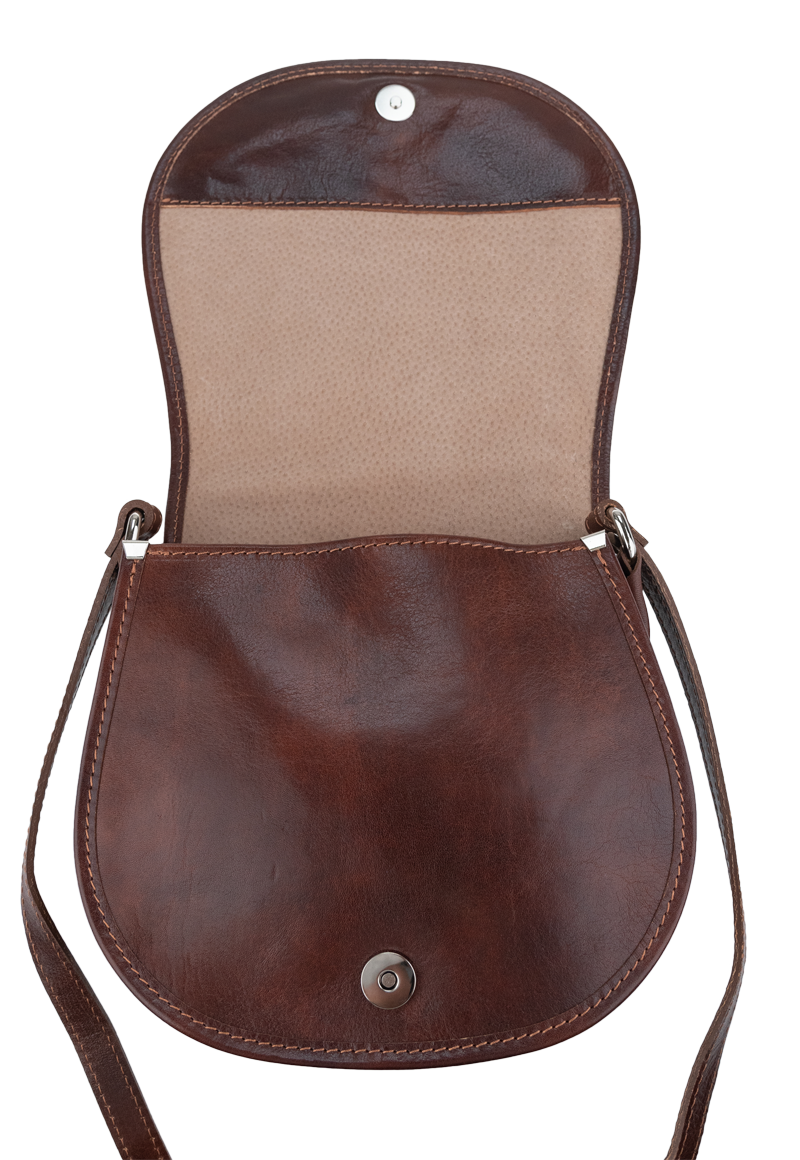 Malá šikovná kabelka se zajímavým tvarem. Kabelka je vyrobená z pravé kůže, která velice dobře drží svůj tvar. Je vhodná na nošení přes rameno nebo cross-body (křížem).